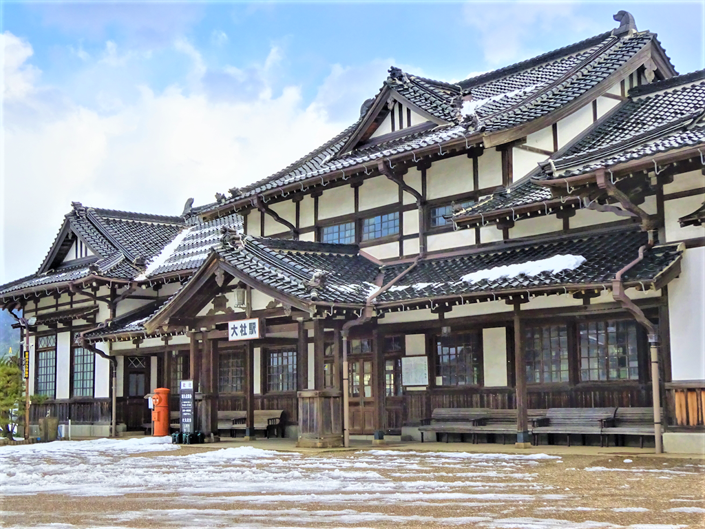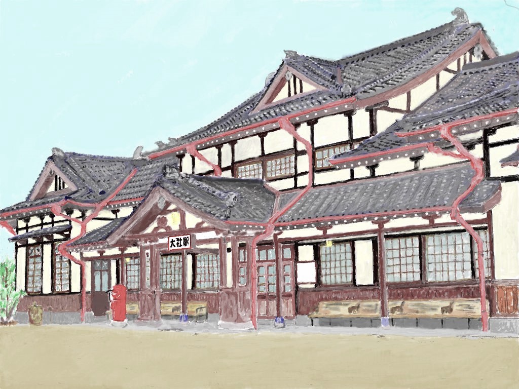 明治45年6月開業(出雲市〜大社間)して以来、平成2年の廃駅まで出雲大社の表玄関口として親しまれてきた駅舎。神社様式を取り入れた格調ある純日本風の木造建築で、平成16年には国の重要文化財に指定された。(2020.02)