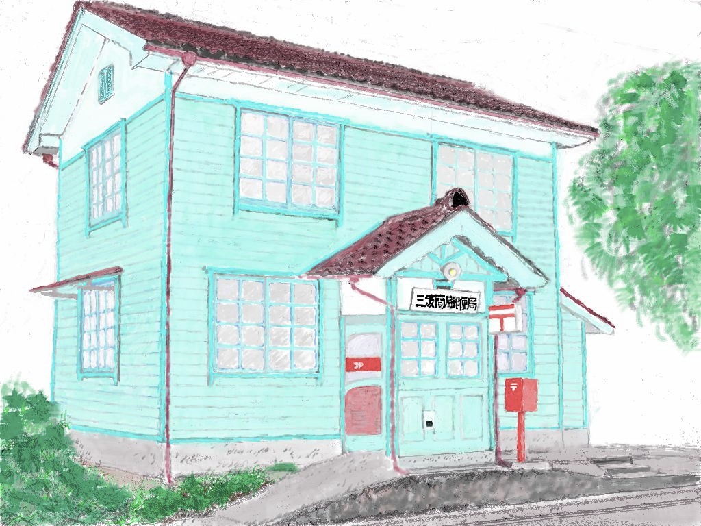 富山湾に向かって立つ、能登の小さな郵便局。郵政民営化直後の日本郵政のCM、ポスター、切手に採用された。郵便局の後ろには、廃線になった能登鉄道の線路があり、その上には廃校になった三波小学校の校舎がある。(2020.01)