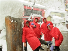 2012年2月 銀山温泉 赤いレインコートと黒いゴム長を履いて、絵画のような温泉街を散策。翌日は、雪の山寺に上り、震災の傷跡が残る松島にまで足を延ばした。観光というよりも、雪国の暮らしを体験しているような楽しさがあった。打ち上げは仙台の牛タン焼き。 |