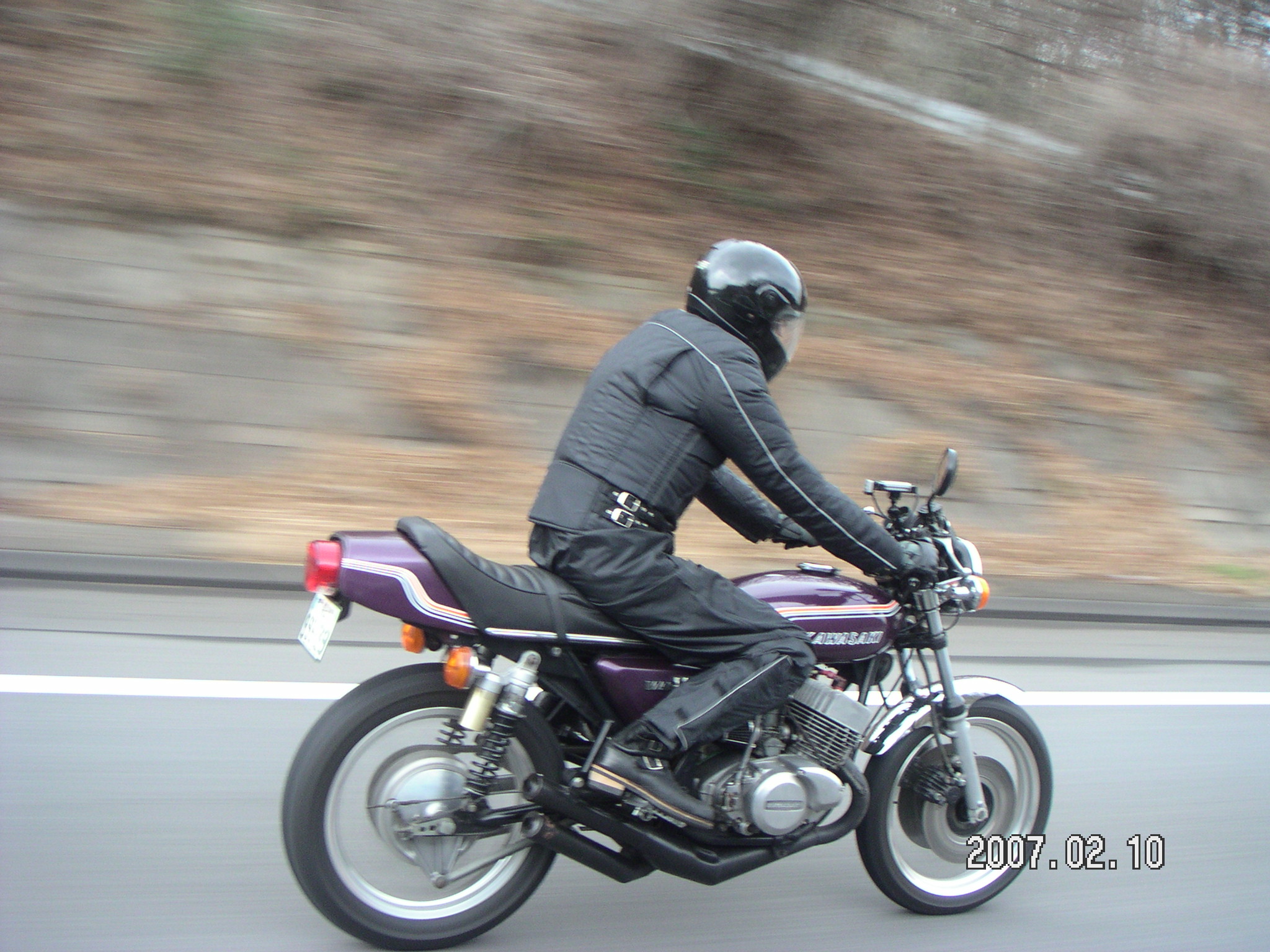 常磐自動車道・守屋SAでO君と合流。今回も自慢のバイク「カワサキ750SS MACH Ⅲ」で参加。