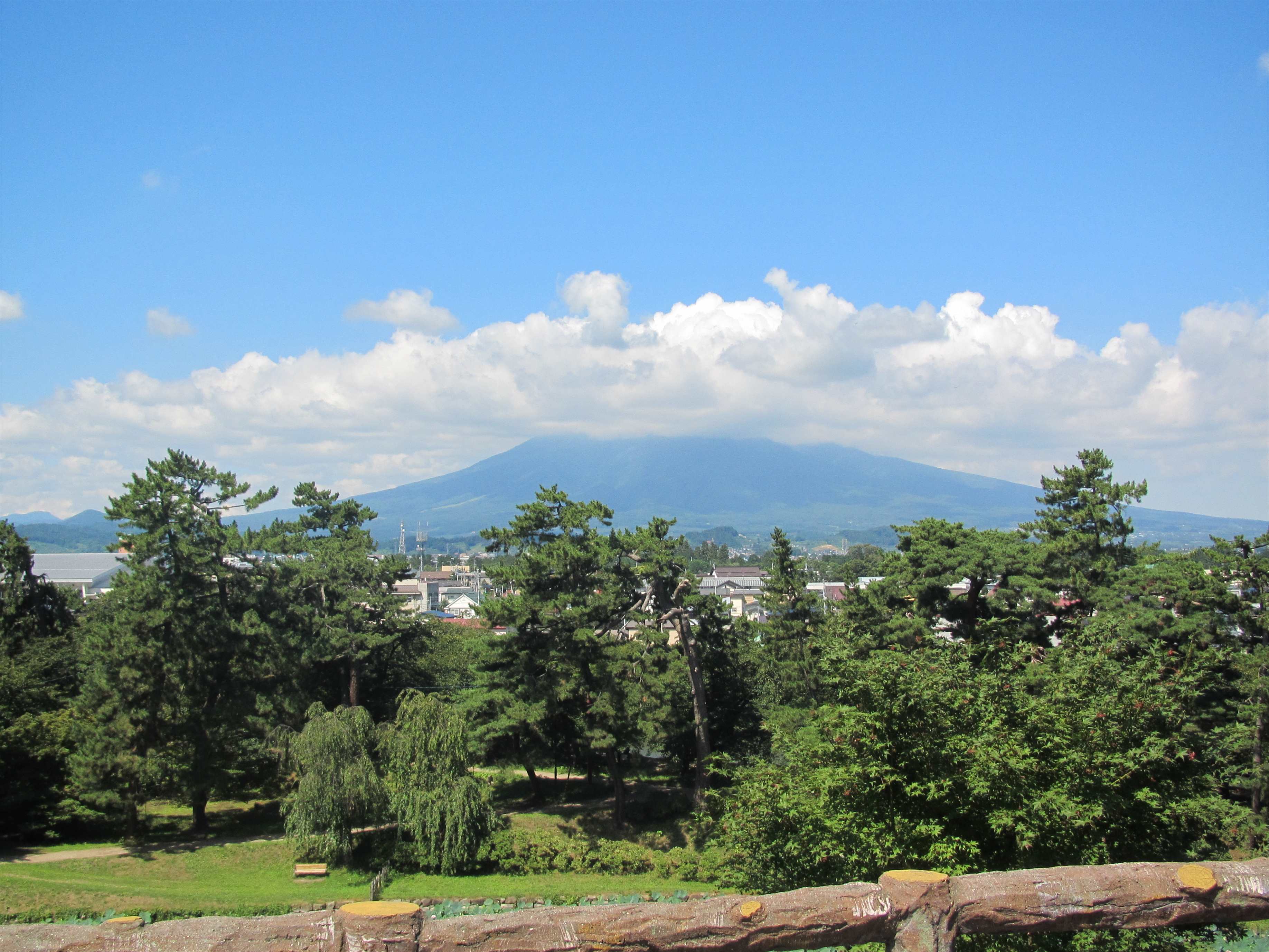 北の廓を抜けて、本丸跡に登ると、右手に岩木山を一望できる場所があった。津軽富士と呼ばれる名峰だが、残念ながら頂上は雲に覆われていた。