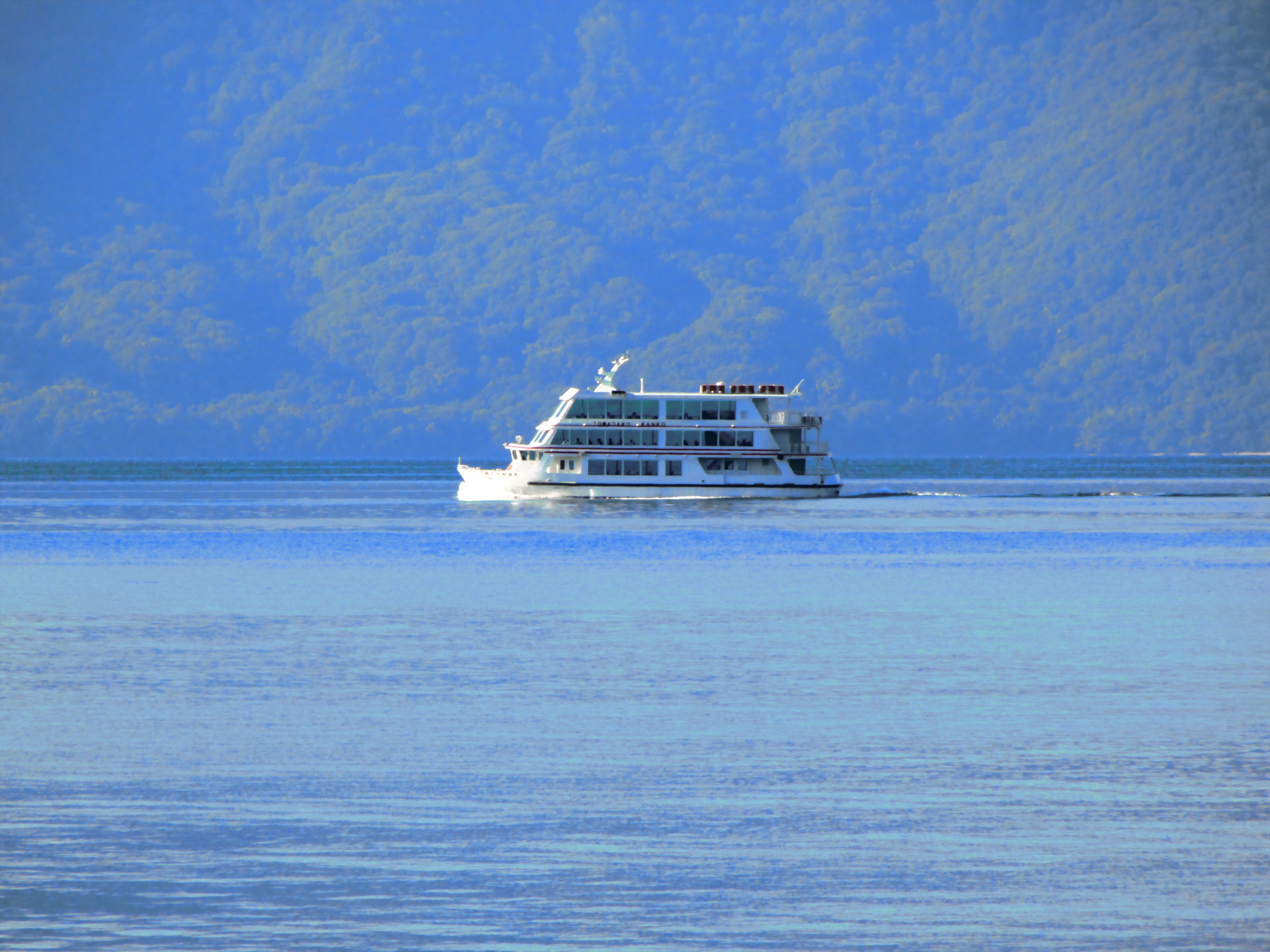 16時発の遊覧船に乗船した。休屋から出て中湖を遊覧し休屋に戻る50分のコースである。湖の南岸から牛の角のように突出する二つの半島に囲まれたところが中湖で、湖面は穏やかで、美しい藍色を呈していた。