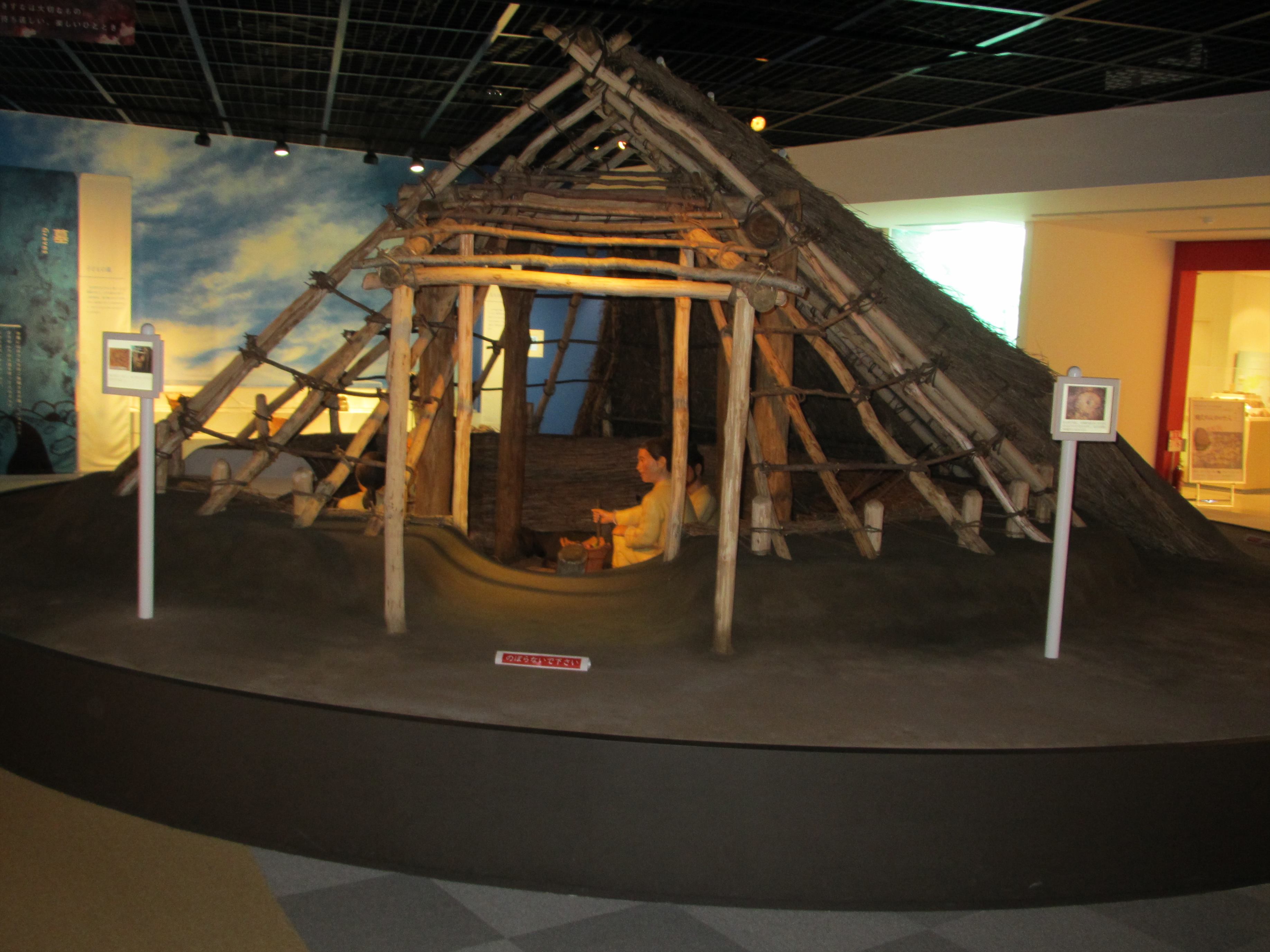 諦めて、三内丸山遺跡に向かった。今から約5500年前~4000年前の縄文時代の大集落跡で、約40ヘクタールの広大な土地に、竪穴住居、高床式倉庫の他に、10棟以上の大型竪穴住居や約780軒の住居跡、大型掘立柱建物跡(六本柱建物)が見つかっている。「縄文時遊館」という入口施設には、土器などの出土品の展示のほかに、人形を用いて竪穴住居内での暮らしのようすをわかりやすく説明している。