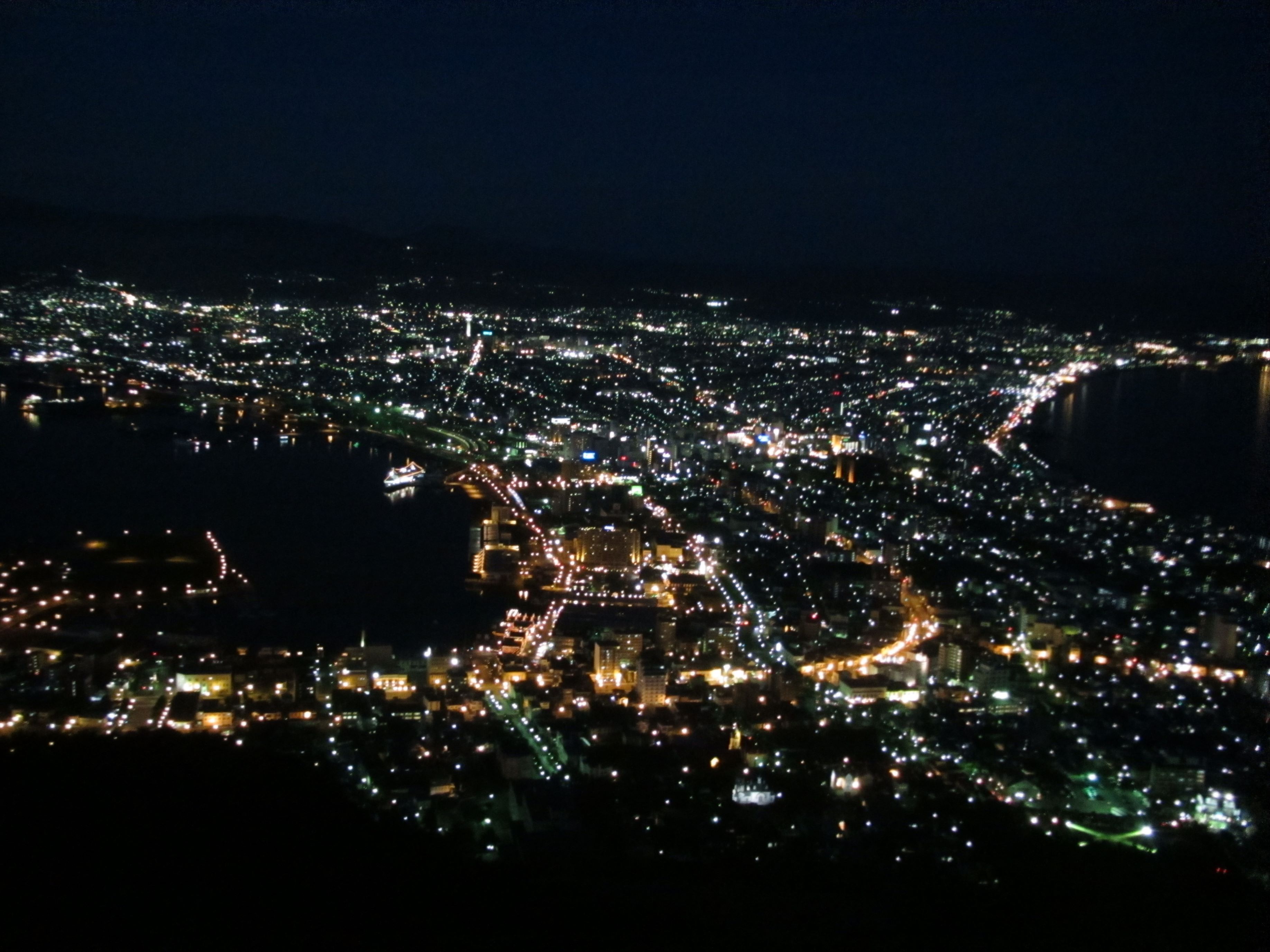 函館駅発18時20分の函館山登山バスに乗車した。函館山まではバスで30分の距離である。ホテルの前にもバス停はあるが、ここから乗ったのでは30分間立ちっぱなしになるので、始発のバス停に行った。すでに行列ができており、なんとか座れたものの、T君とF君は座ることができなかった。函館山登山道路に入り、木立を抜けて夜景が見えると、大きな歓声が上がった。函館山展望台に登ったのは19時、すっかり日も落ちて、鮮やかな夜景が目の前に現れた。節電が推奨されていて、例年よりも光量が少ないという話だったが、十分綺麗で、「ざまあみろ」と叫びたくなった。