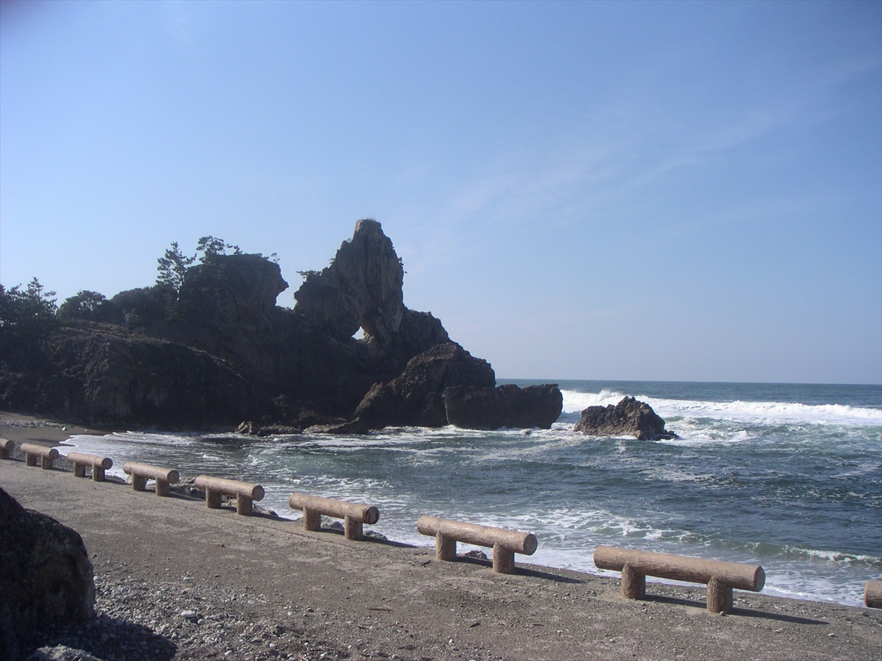 見附島は、弘法大師が布教のために佐渡から能登へと渡る際に発見したといわれ、最初に「目についた島」というのが名前の由来だという。しかし、この頃は陸続きだったのだから、この話は明らかに嘘である。