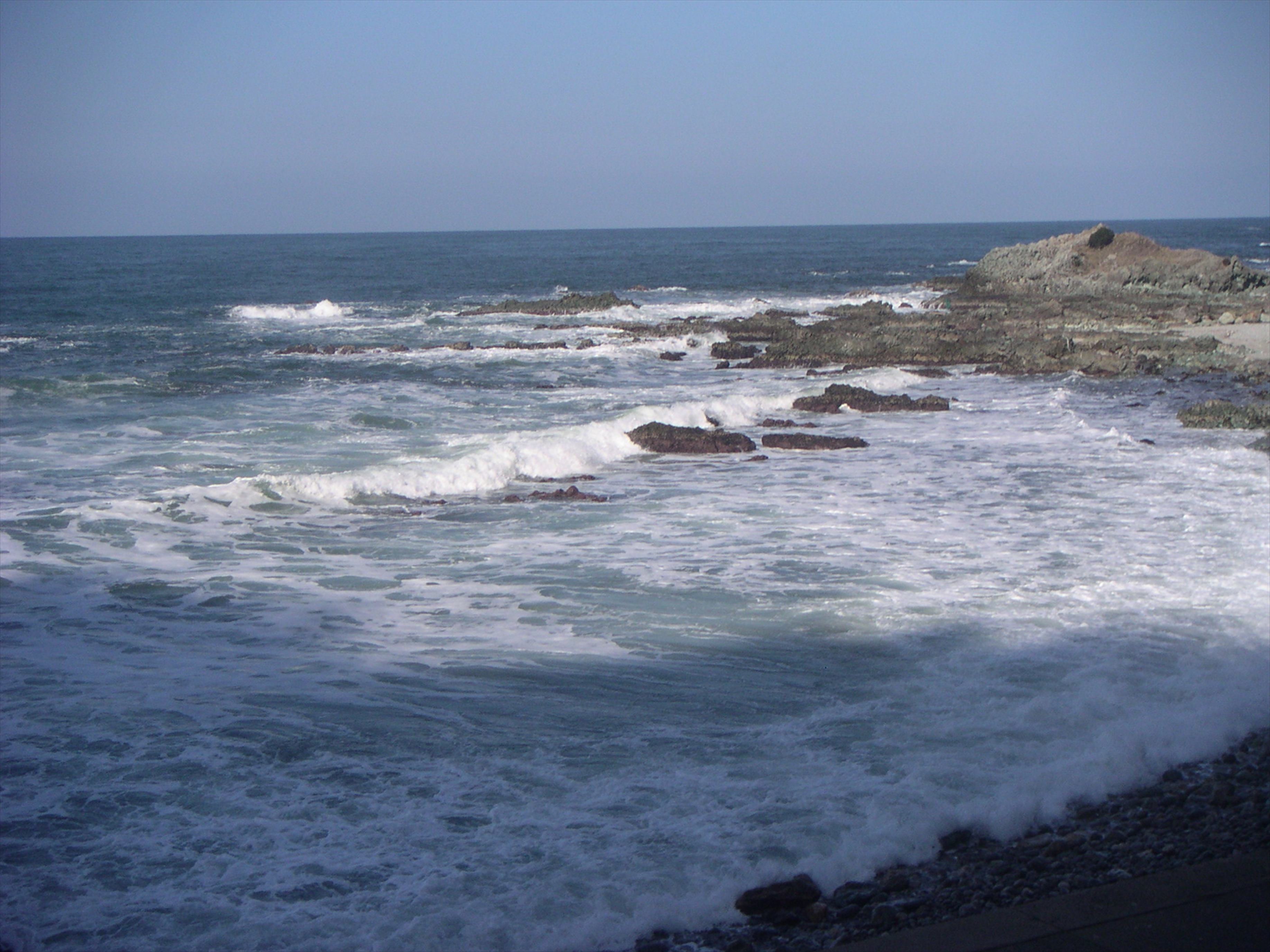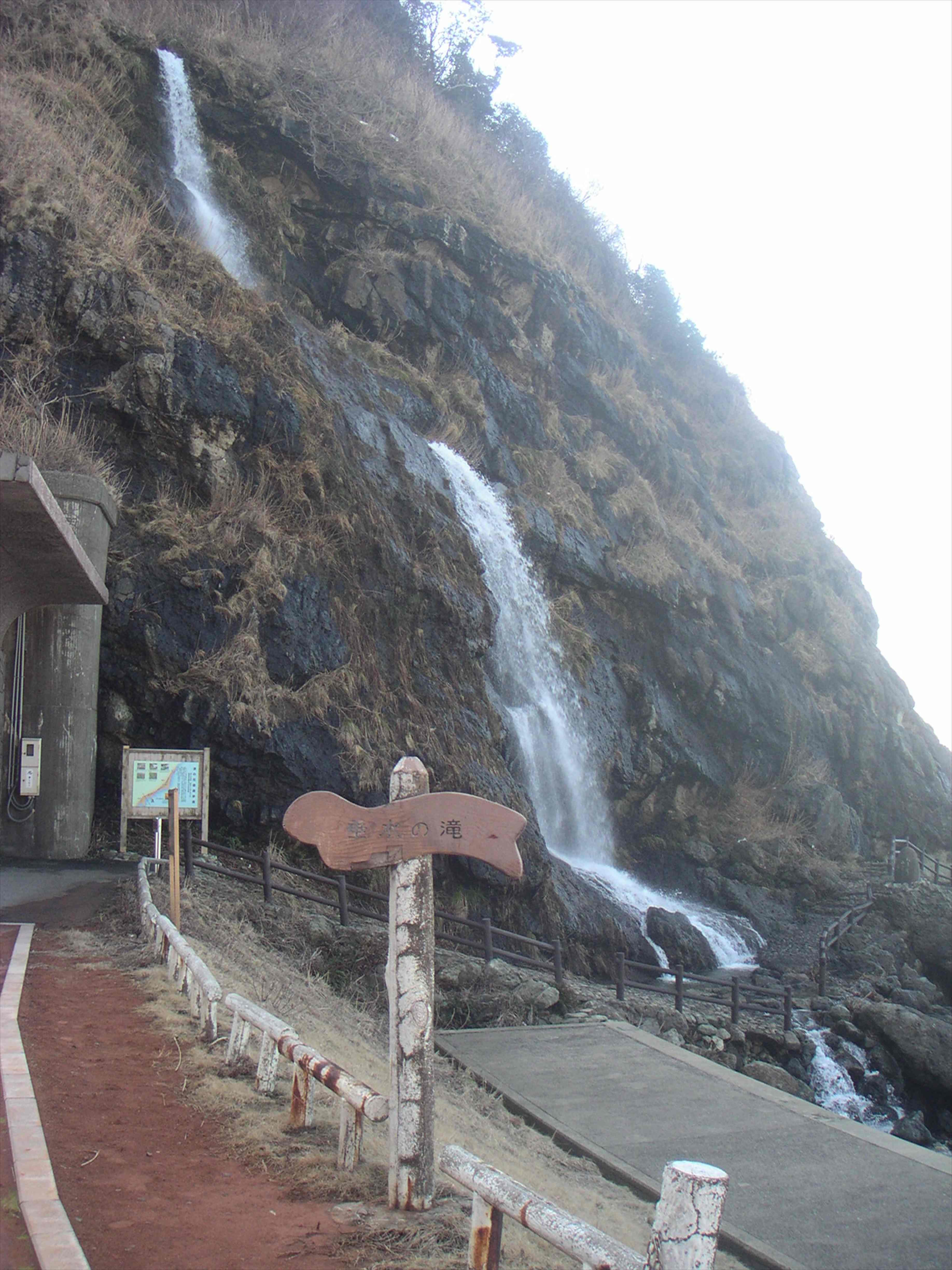 でもそれだけなので、写真を2、3枚撮るとすぐ出発した。「窓岩」から5分、トンネルを抜けた先にあるのが、「波の花」の代表的な鑑賞スポットの一つ真浦海岸だ。「垂水(たるみ)の滝」があることでも知られている。