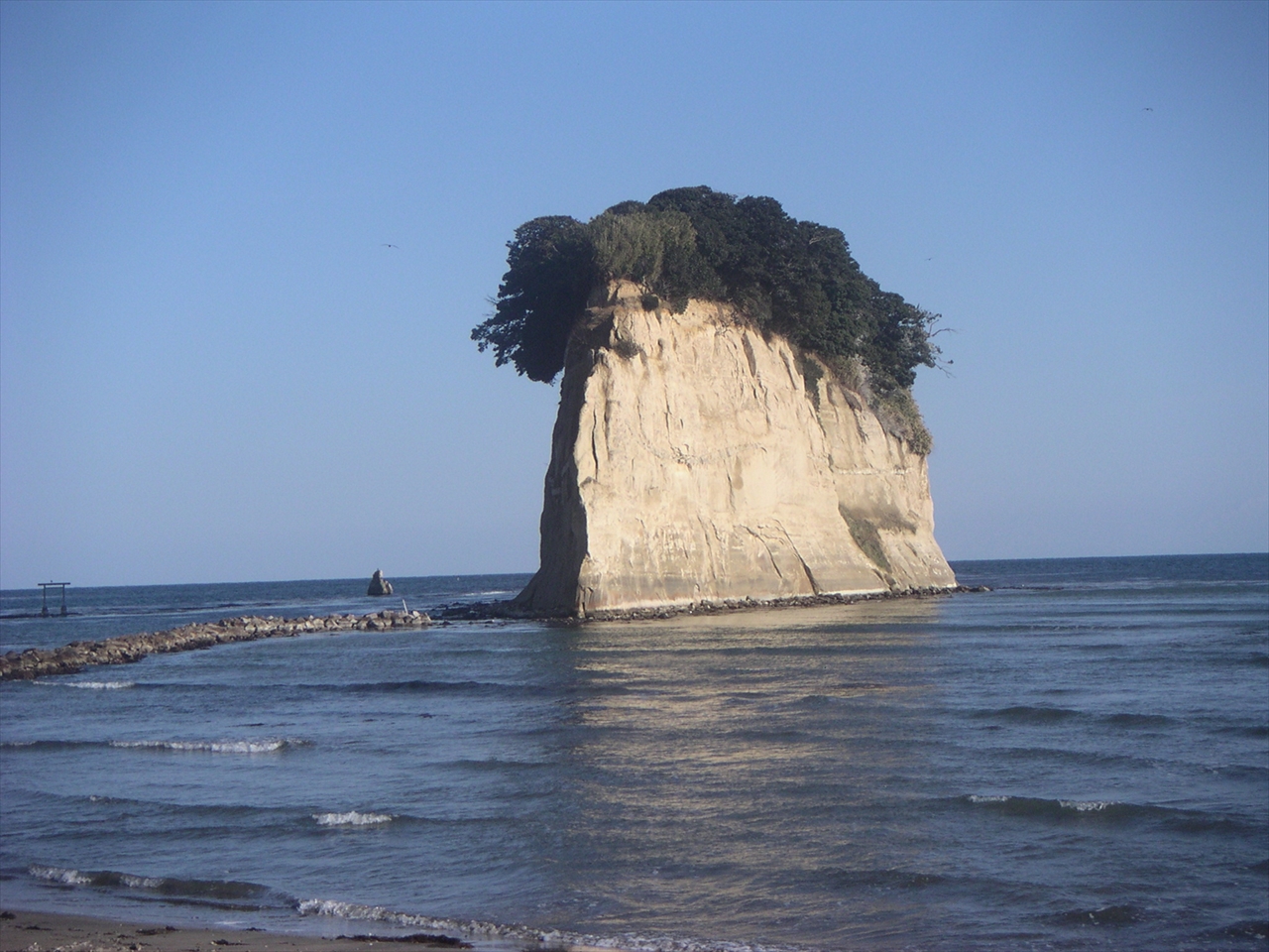 見附島は能登・内浦の海に浮かぶ無人島である。白い地層は珪藻土で、頭にだけ緑が生い茂るおもしろい姿をしている。約150年前までは陸続きだったが、地層が柔らかいことから波に激しく侵蝕され、陸から切り離されて今の形となったという。浸食は今も続いているというから、やがてアイスクリームが溶けるように消滅する運命にある。島の上には見附神社(見附弁財天社)という社があったが、平成5年の能登沖地震で社殿が崩壊したらしい。島への上陸は不可能だから、陸続きの頃に建立されたのだろう。