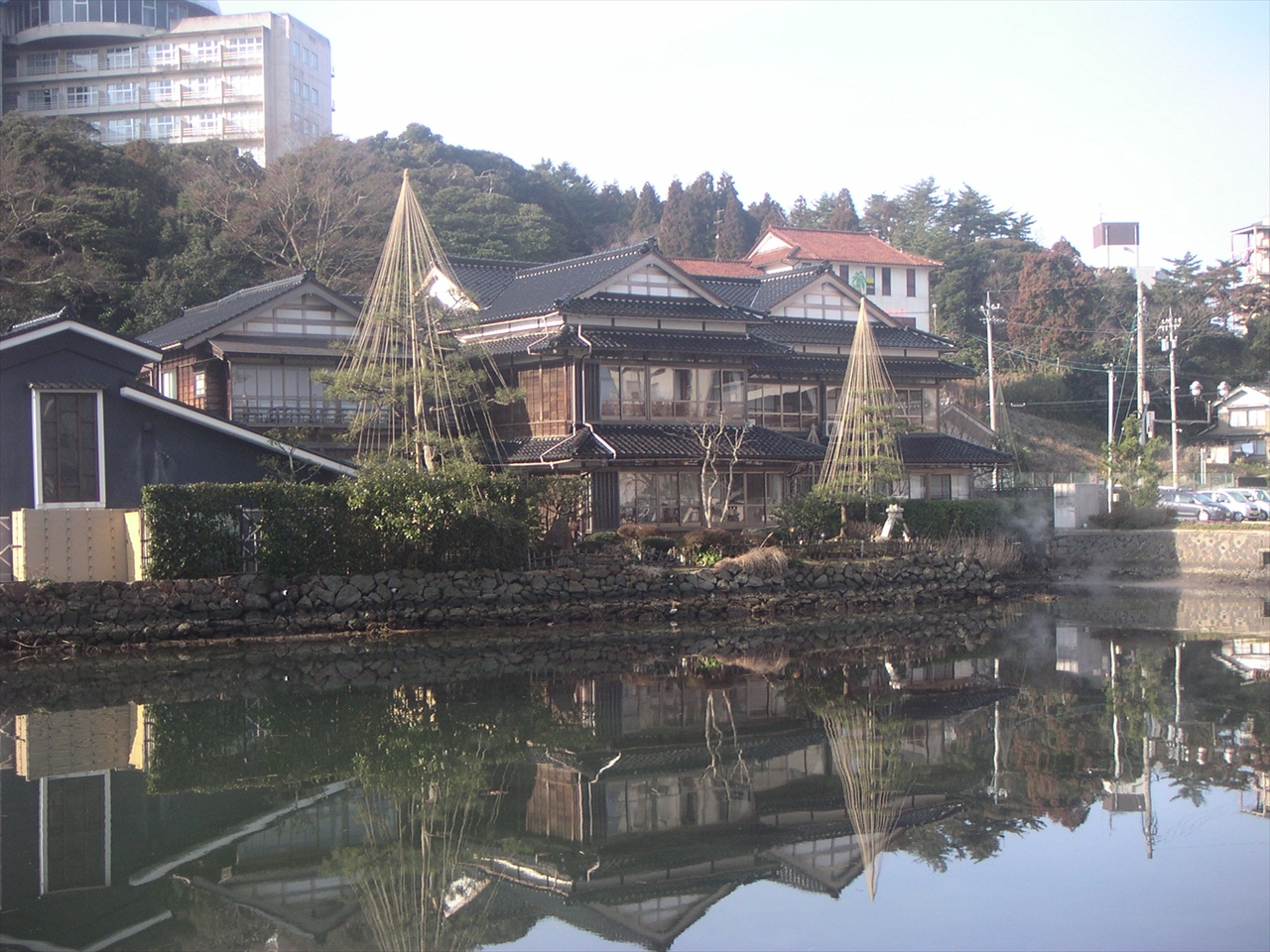 この日の宿は渡月庵である。建物は大正四年に建築されたもので、大正浪漫の宿と銘打っている。外見はなかなかいい雰囲気だが、大型温泉ホテルに囲まれて、部屋からの眺望はすこぶる悪い。泊まった部屋は2階の角部屋で、広さは控えの間4.5畳、本間10畳、それに本間を囲む大きな縁側がある。欄間は旭日と鶴亀が彫刻がされており、床の間は、床柱・床框とも黒檀が使われている。この旅館の特別室で、皇族の方がご宿泊されたこともあったらしい。