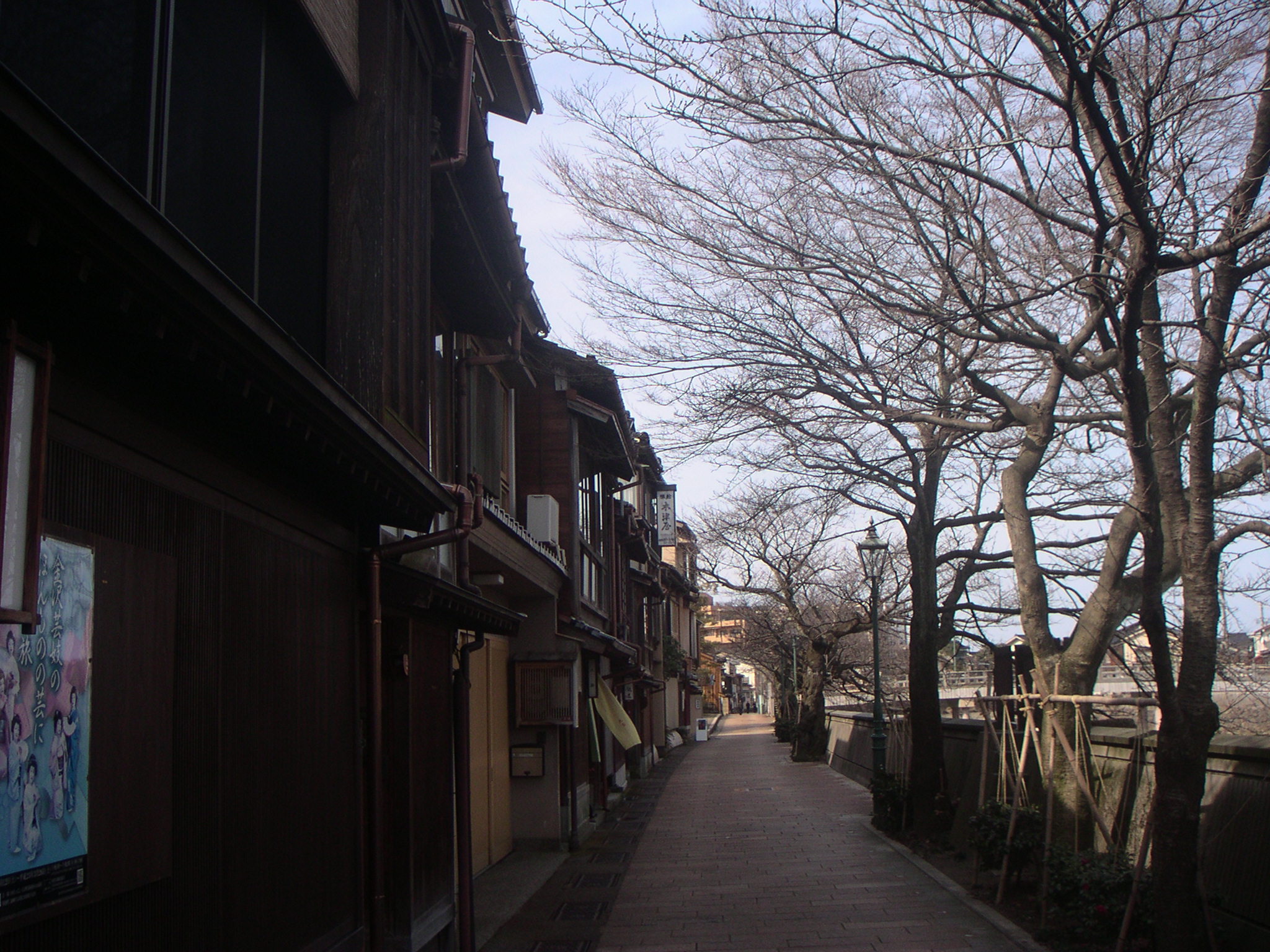浅野川をはさんで北西にも茶屋街の1つである主計町がある。主計町と書いて、「かずえまち」と読む。ここも重要伝統的建造物群保存地区で、明治期から昭和戦前期にかけて栄え、当時の建造物が多く残っている。浅野川大橋から中の橋までの川沿いの道を散策したが、美しいというよりもゴミゴミした印象だ。夜の町なので、昼間は歩いて通り過ぎるだけだった。