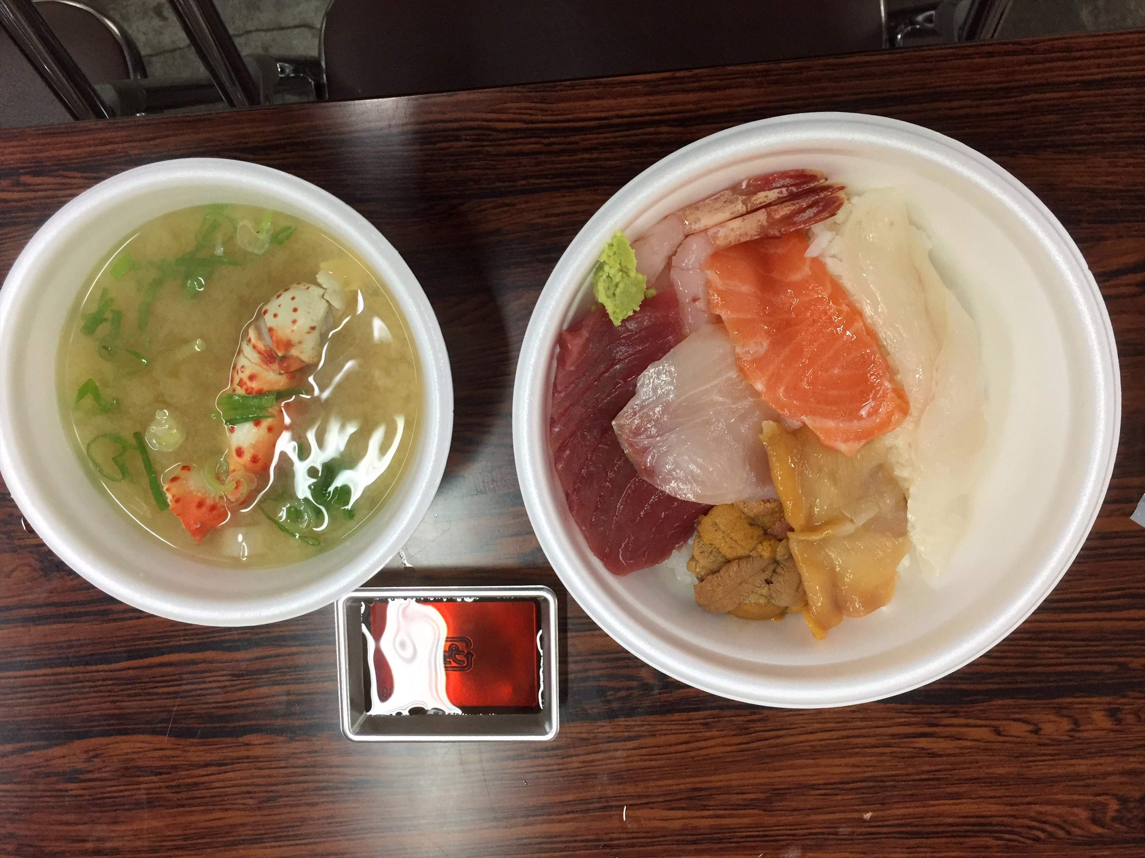 まだ丼の半分くらいが空いているので、別の店に。「橋本商店」の裏に回ると、別の「佐藤商店」が出てきた。ご飯の店と同じ経営なのかもしれない。残りはここで購入。やはり、押し売り気味にせめてくる。サーモン、カンパチ、おひょいを選んで、700円。ご飯と味噌汁をいれて、総額1800円のオリジナル海鮮丼になった。