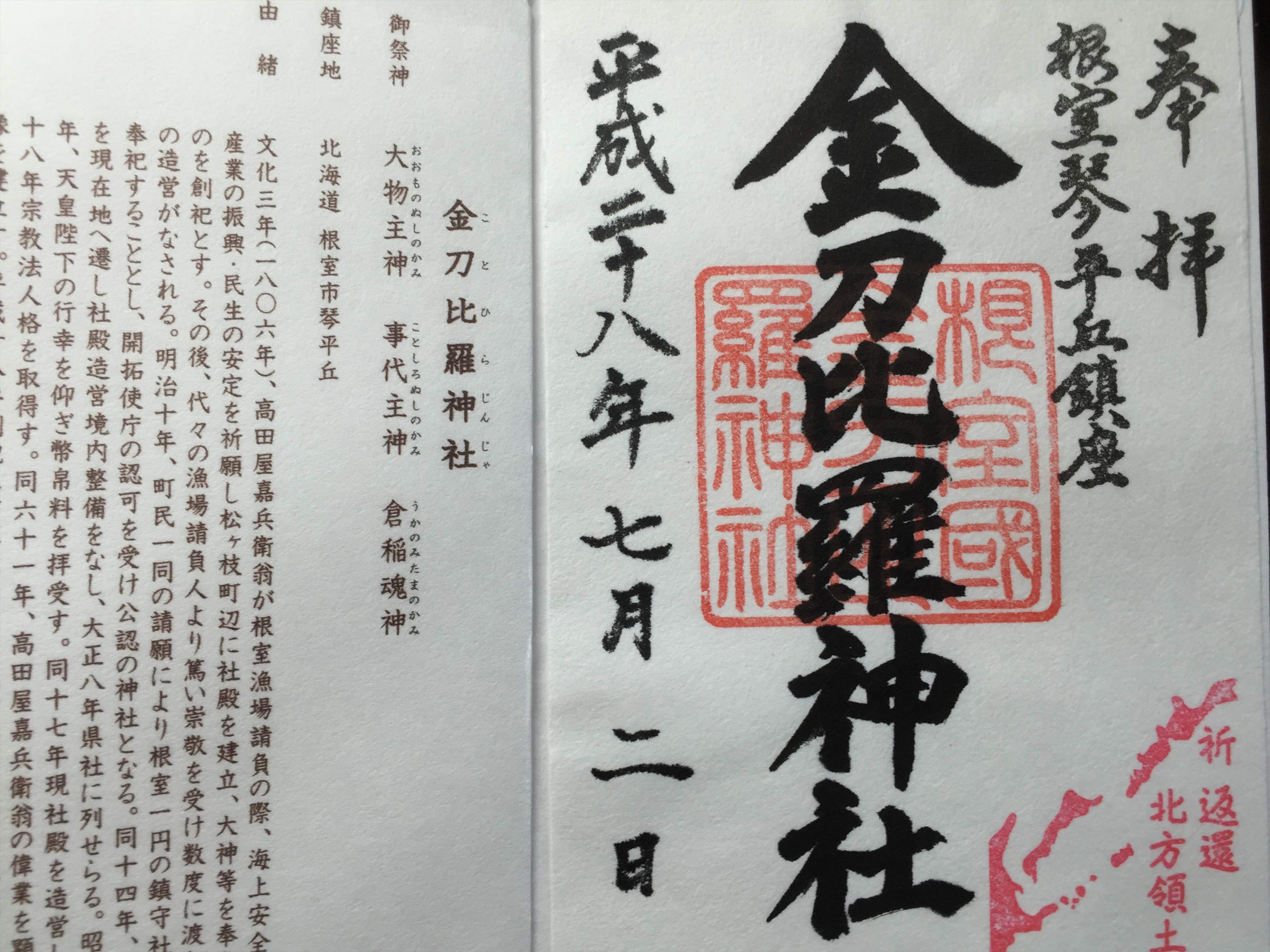 あまり時間がなかったので、社殿の参拝と社務所で御朱印を頂くだけになった。御朱印には「祈 返還 北方領土」の赤いスタンプが押されていた。終戦後、北方領土にソ連軍が侵攻してきたとき、歯舞群島、色丹島、国後島に鎮座していた神社のうち十一社のご神体を持ち帰り、根室金刀比羅神社に仮遷座しているということである。