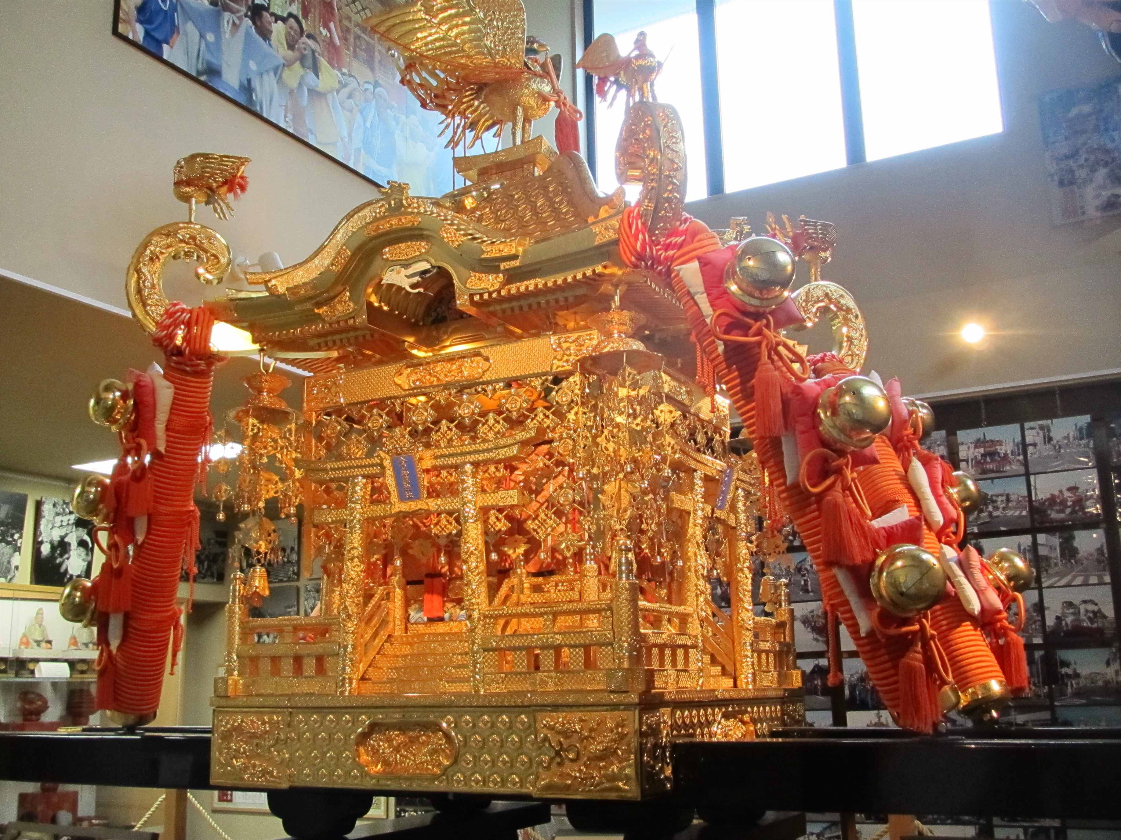 社務所の受付の前が神輿殿で、まばゆいばかりの金色の御神輿が置かれていた。根室金刀比羅神社の例大祭は根室最大のお祭りで、産業の振興と地域の安全を祈願し、毎年8月9日から3日間にわたって行わる。市内が4つの祭典区に別れ,山車・先太鼓・金棒・手古舞の演舞で競い合い、この金色の御神輿の御巡幸が最大の見どころらしい。