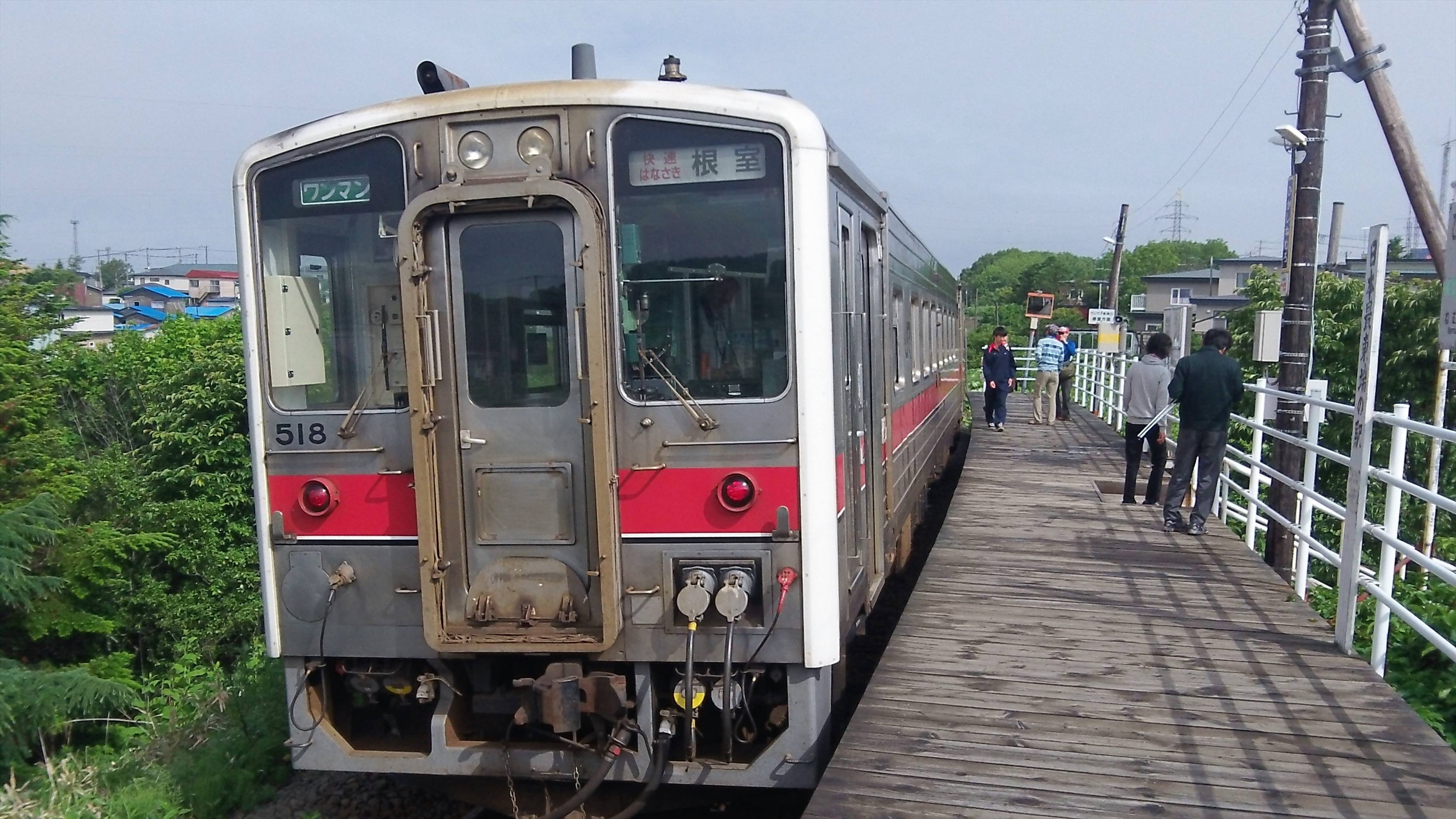 朝8時に「根室行快速はなさき」が到着するので、せっかくだから、列車の到着まで見届けることにした。やってきたのは、一両編成のディーゼル車。中はガラガラだ。到着するなり、窓を開けて、看板の写真を撮りまくる乗客がいた。なるほど、列車の中からのほうが写真は撮りやすい。しばらくして、数名の乗客がホームに降りてきた。すべて旅行者で、写真だけ撮ったら、再び、列車に乗り込んでいった。運転手も慣れたもので、せかすわけでもなく、乗客が戻るのを平然と待っていた。