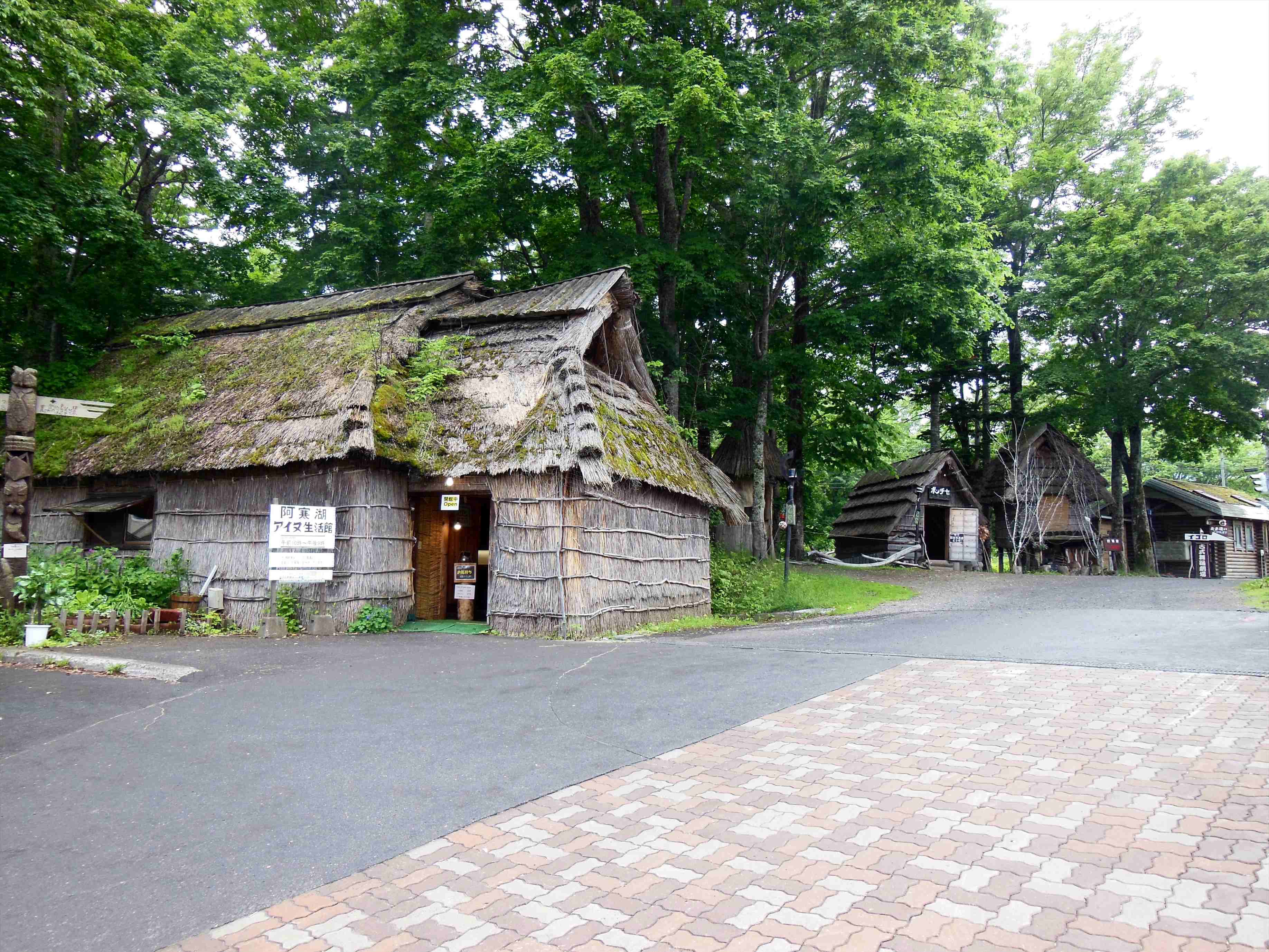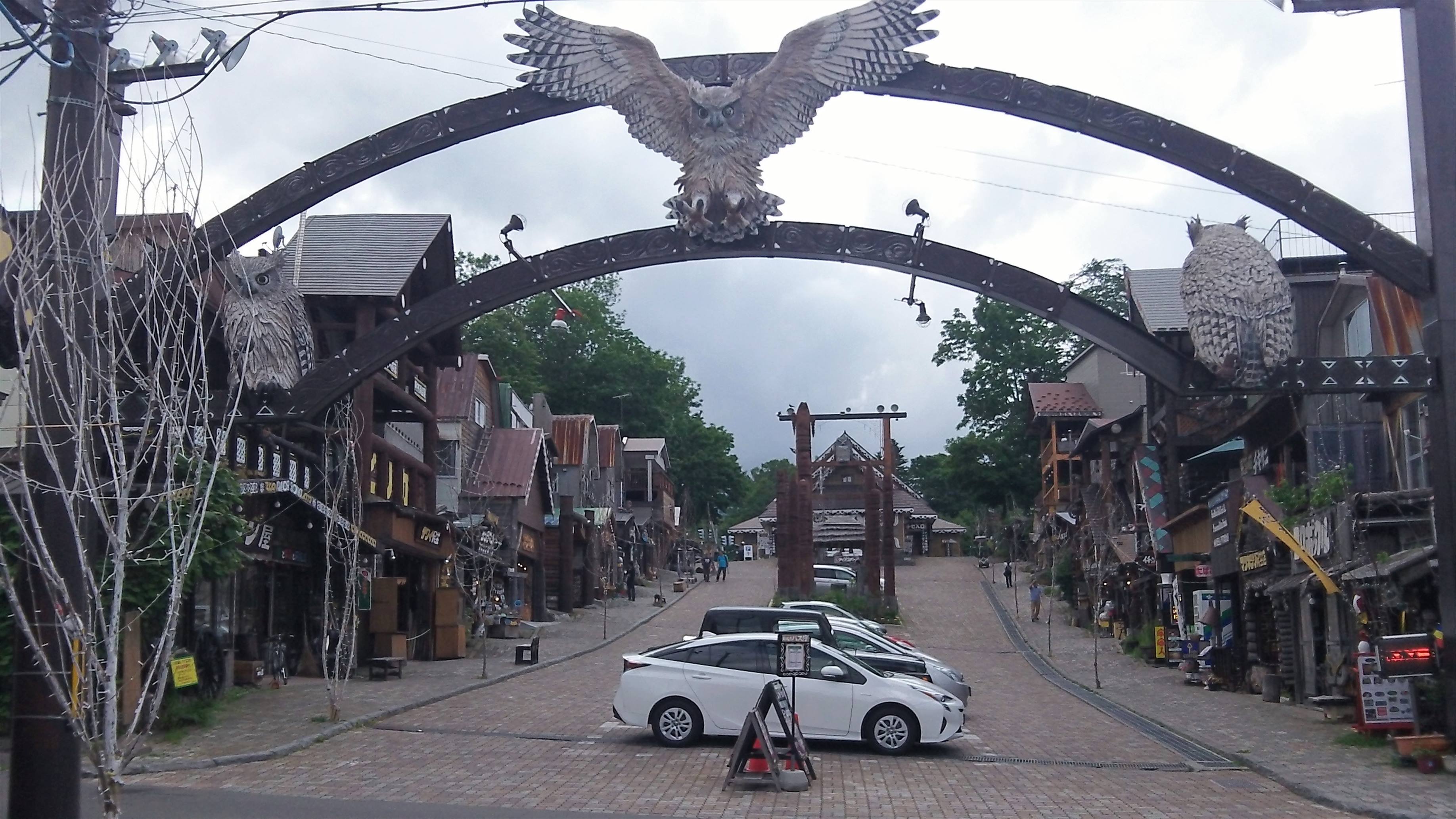 湖畔の第2・3駐車場がおすすめと聞いていたが、場所が分からなかった。周辺をウロウロしたあげく、阿寒湖アイヌコタンの無料駐車場に停めることになった。アイヌコタンとは、北海道の先住民族であるアイヌの人々が暮らす集落のことである。阿寒湖アイヌコタンは130名あまりのアイヌ民族が暮らしており、北海道で一番大きなアイヌコタンだという。かつてのアイヌ民家を再現した建物や、アイヌに伝わる木彫などの民芸品店や飲食店など数十店が並んでいる。伝統あるアイヌ古式舞踊を見学することもできる。