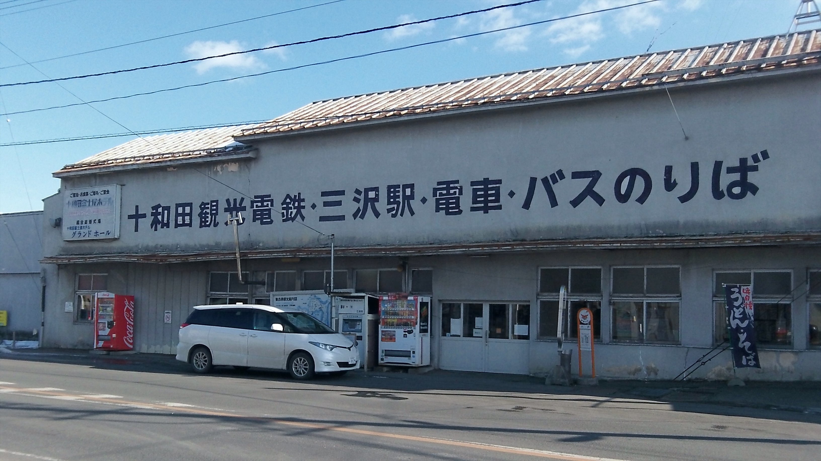 三沢駅のバス停は、十和田観光電鉄三沢駅の前にある。鉄道は2012年に廃線になり、今はバスの待合室として利用されているだけだが、電車の文字はそのままになっている。