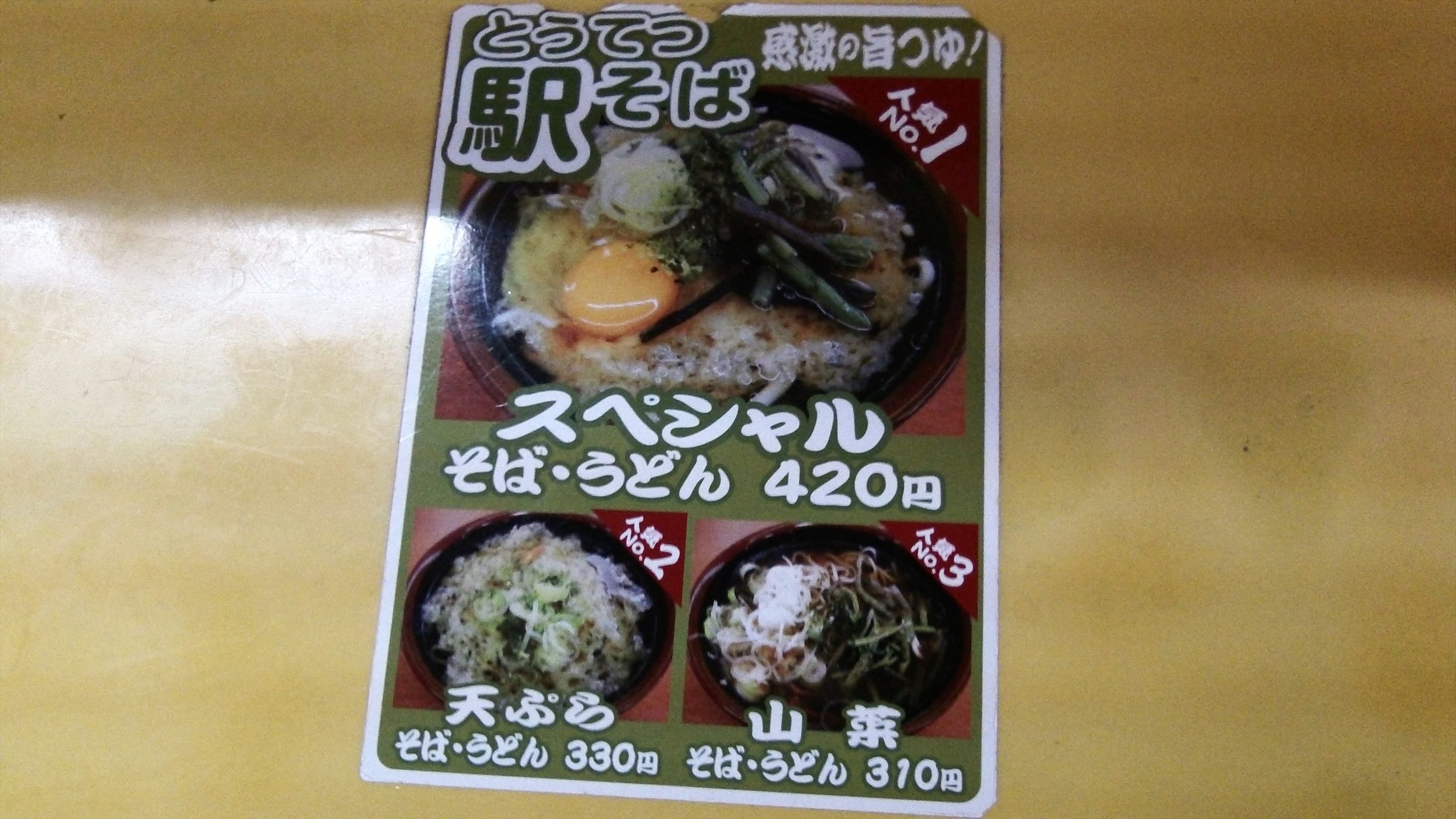 この廃墟のような建物の中で、いまでも蕎麦屋が一件だけ営業している。昔懐かしいかんじの駅そばだが、立ち食いではなく、すべて椅子席である。注文したのは、天ぷら、山菜、山芋、生卵が入ったスペシャルそば、420円。