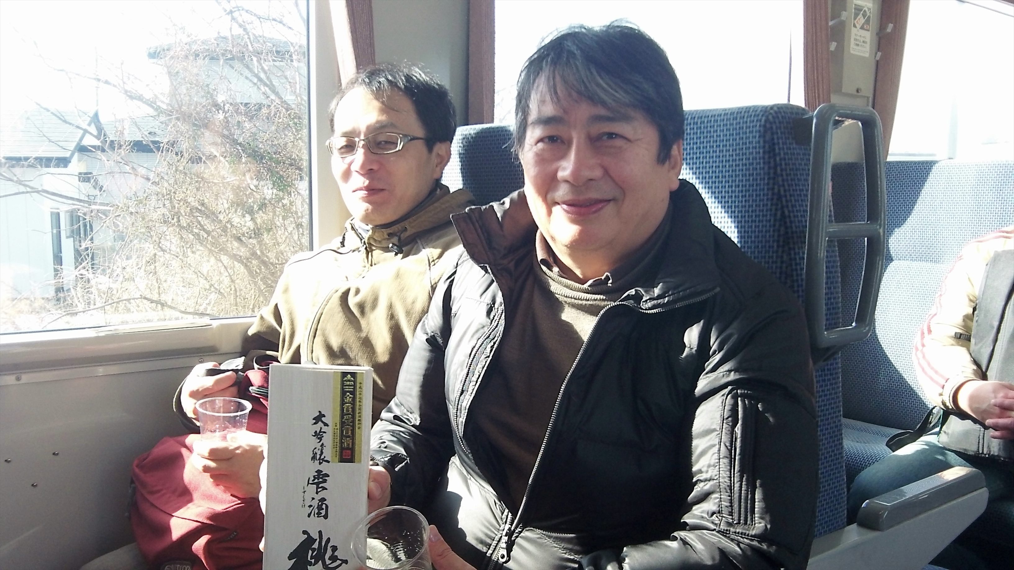 大湊行きは2両編成のボックスシート車両。車内は地元客で混み合っていて、相席になった。席に座ると、さっそく酒盛りである。大騒ぎするわけではないが、昼間から酒盛りする集団との相席は迷惑だったに違いない。