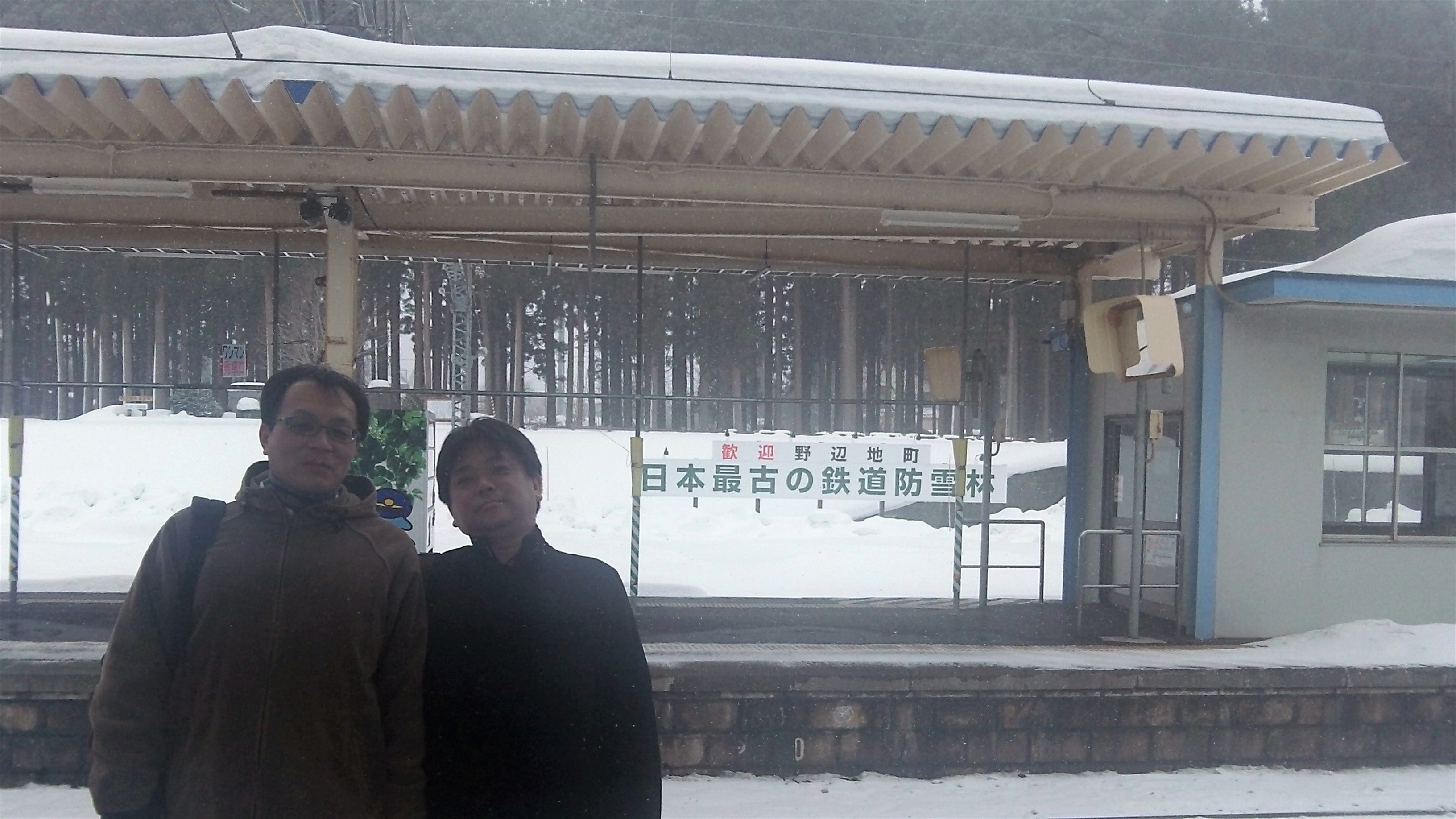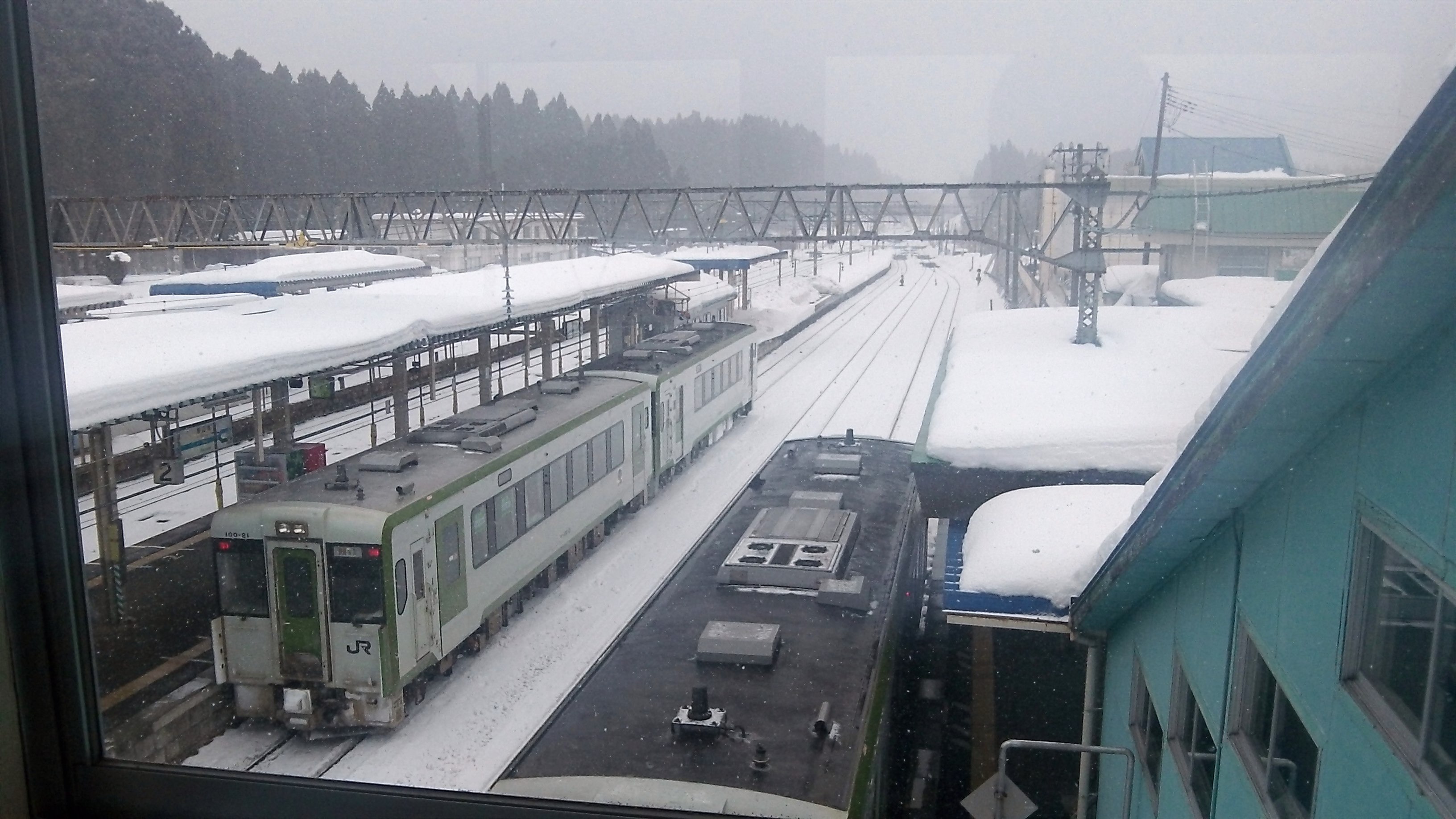 三沢を過ぎると外の様子が一変、横殴りの雪が吹き荒れる薄暗い雪国になった。