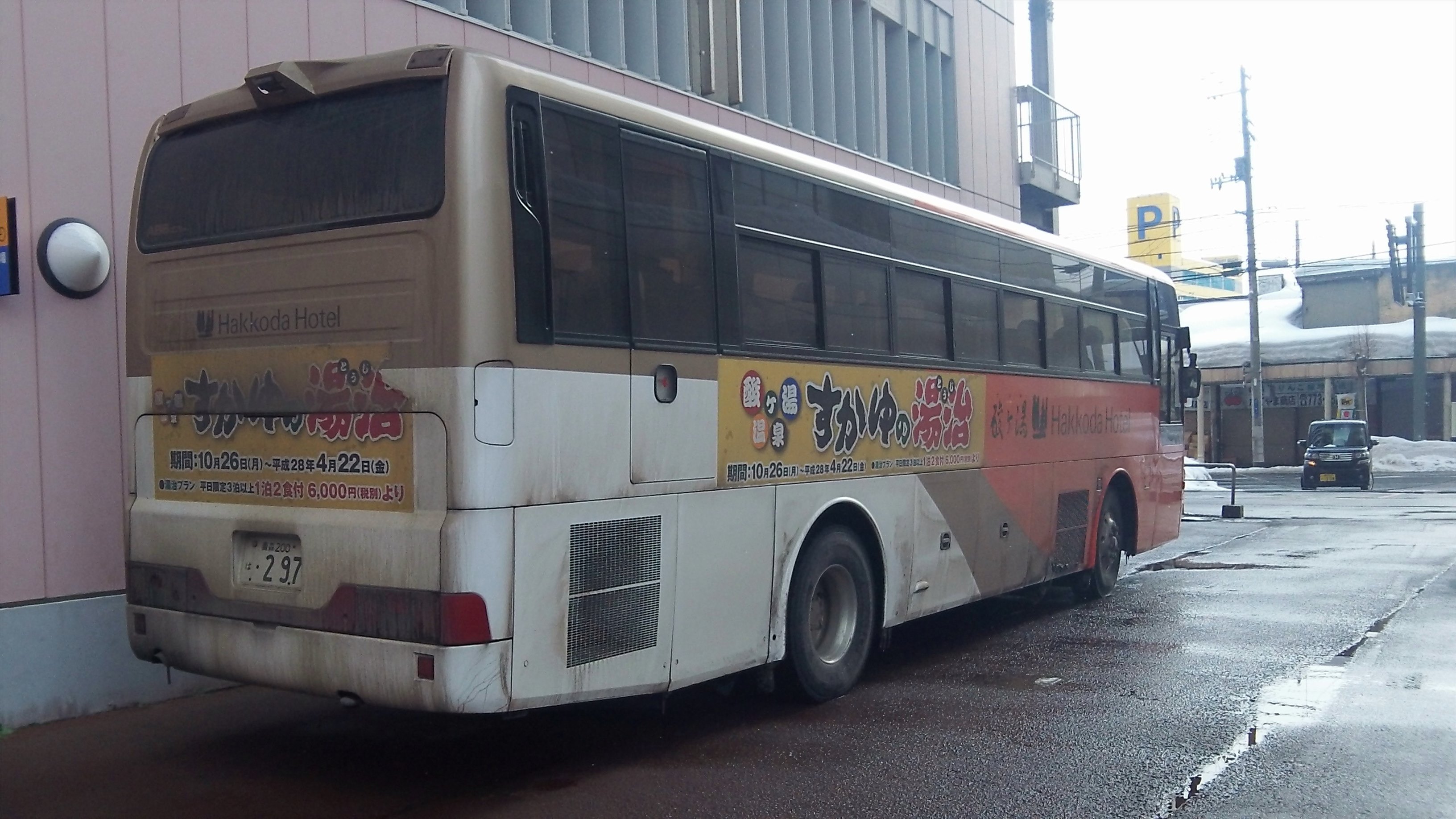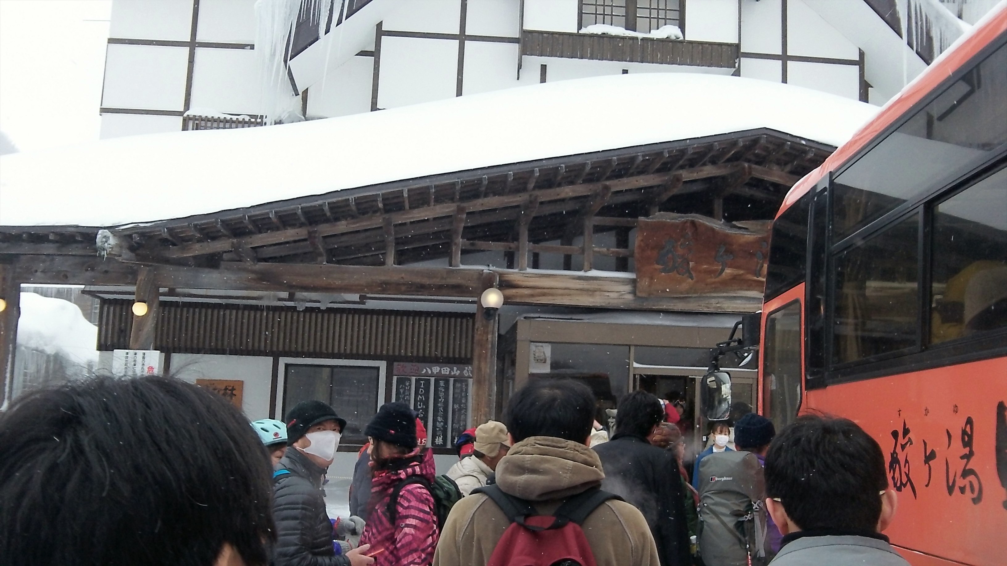 酸ヶ湯温泉の無料送迎バスの発車場所は、青森駅前のアウガ駐車場横である。事前に場所を確認しておいたので迷うことはないと思っていたが、ビルの陰に停車していたので、すぐに確認できなかった。乗換時間が短いので少し焦った。中は満席だった。