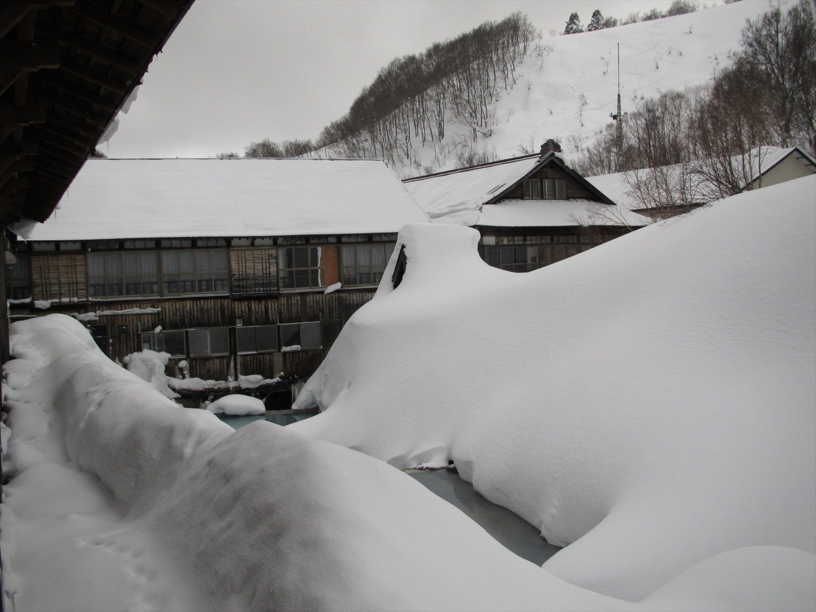 酸ケ湯は世界有数の豪雪地帯で、一昨年の記録的な大雪のときも、酸ヶ湯の積雪量が話題になった。この年は暖冬のせいか、想像していたよりも普通だった。それでも一夜あけたら、駐車場の車はことごとく雪の中に埋没していた。ひとたび雪が降るとすさまじい。