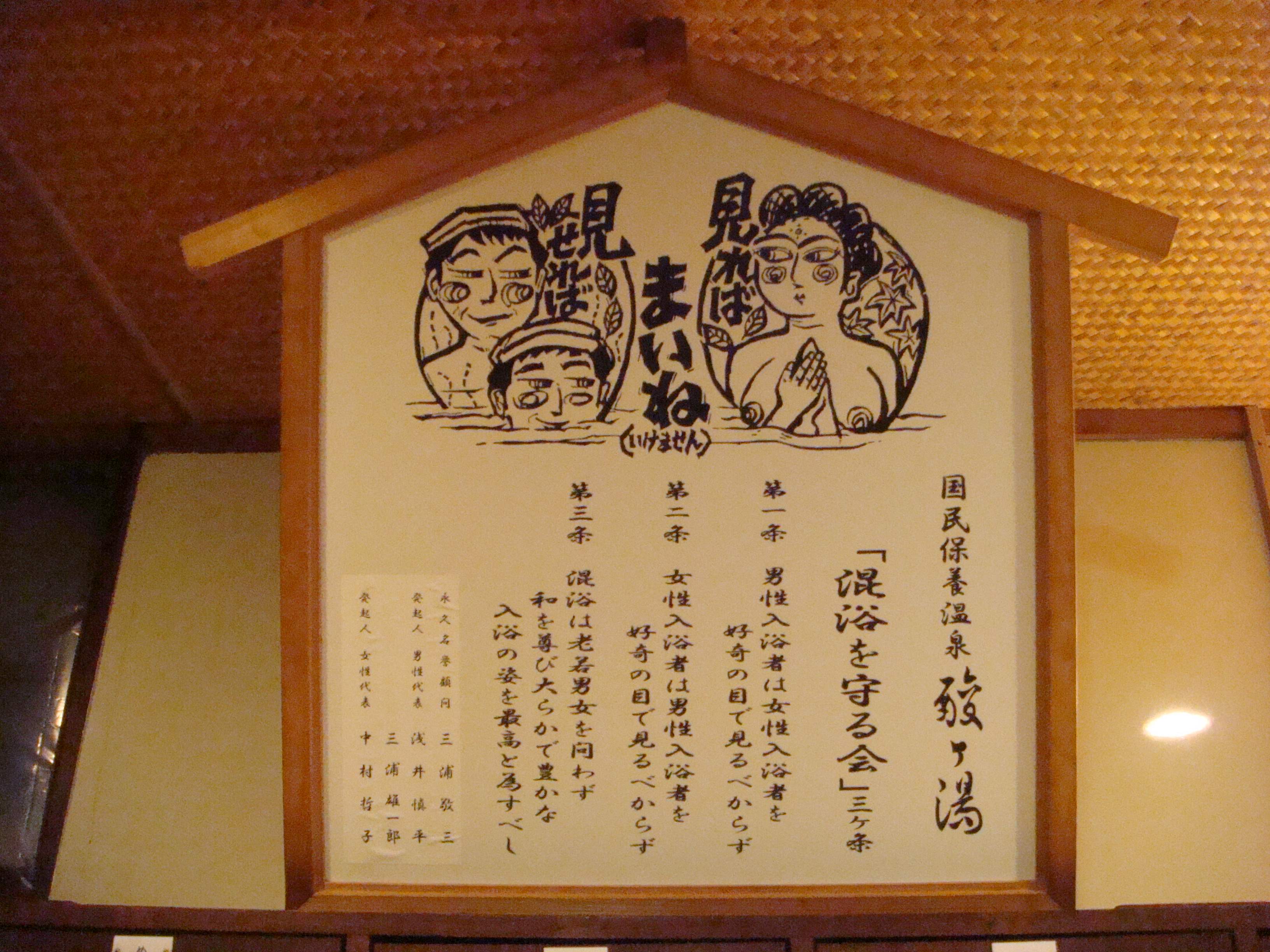 大きな浴槽が2つあり、「熱の湯」と「四分六分の湯」という。奥にある「四分六分の湯」はかなり熱い。泉質は酸性硫黄泉で、硫黄臭はそれほどきつくないが目に入ると痛い。混浴だが、浴槽の中央あたりに男女を区切る目印が置かれている。女性が何人かいたようだったが、湯気のせいで姿は確認できず、声で女性と分かるぐらいだった。