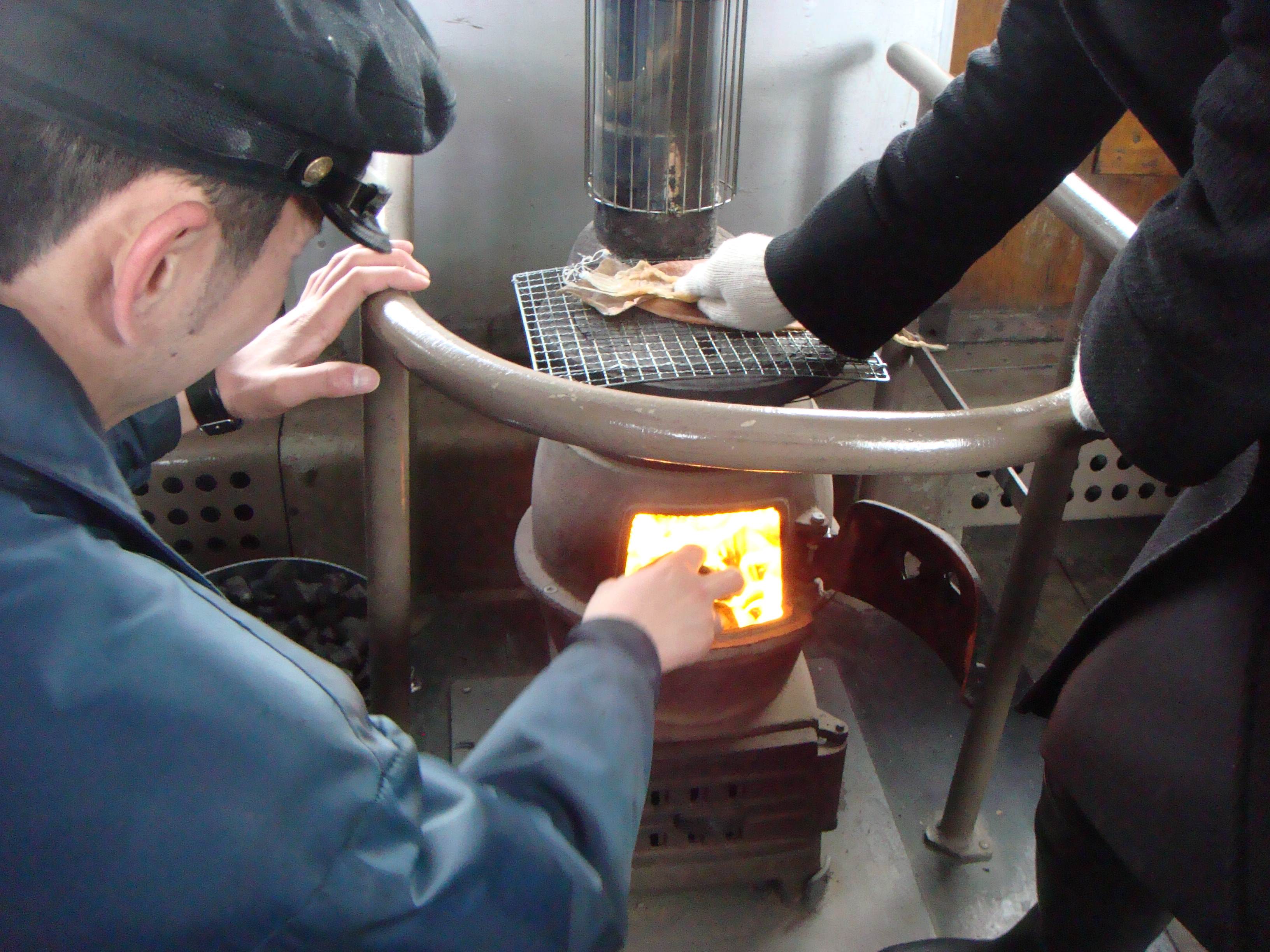 スルメは意外に早く焼ける。焼けると、スルメを買ったお客さんのもとへ急いで届ける。ダルマストーブは車両の前後にあるので、混み合った車内を頻繁に往復する。なかなか大変だ。