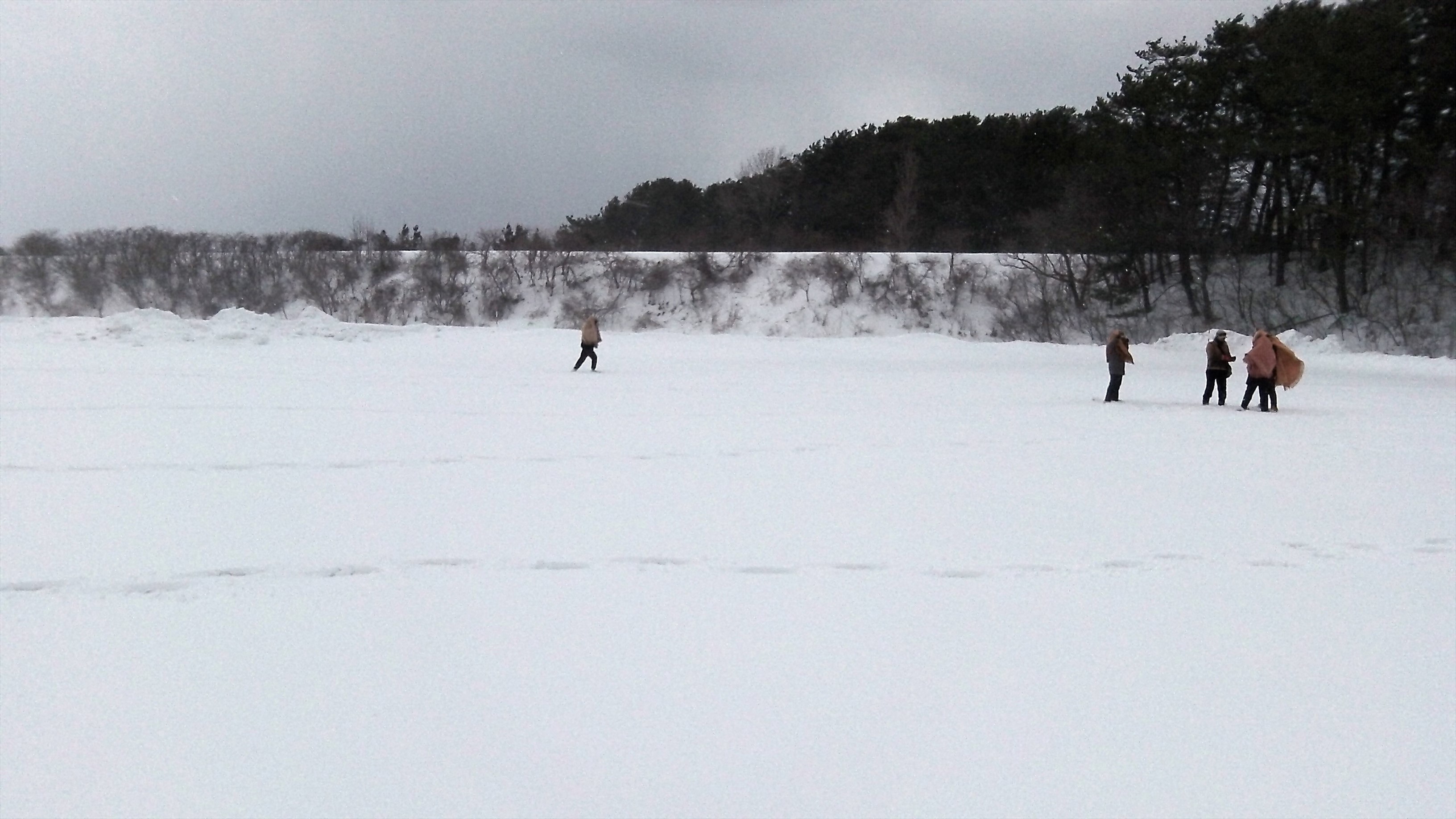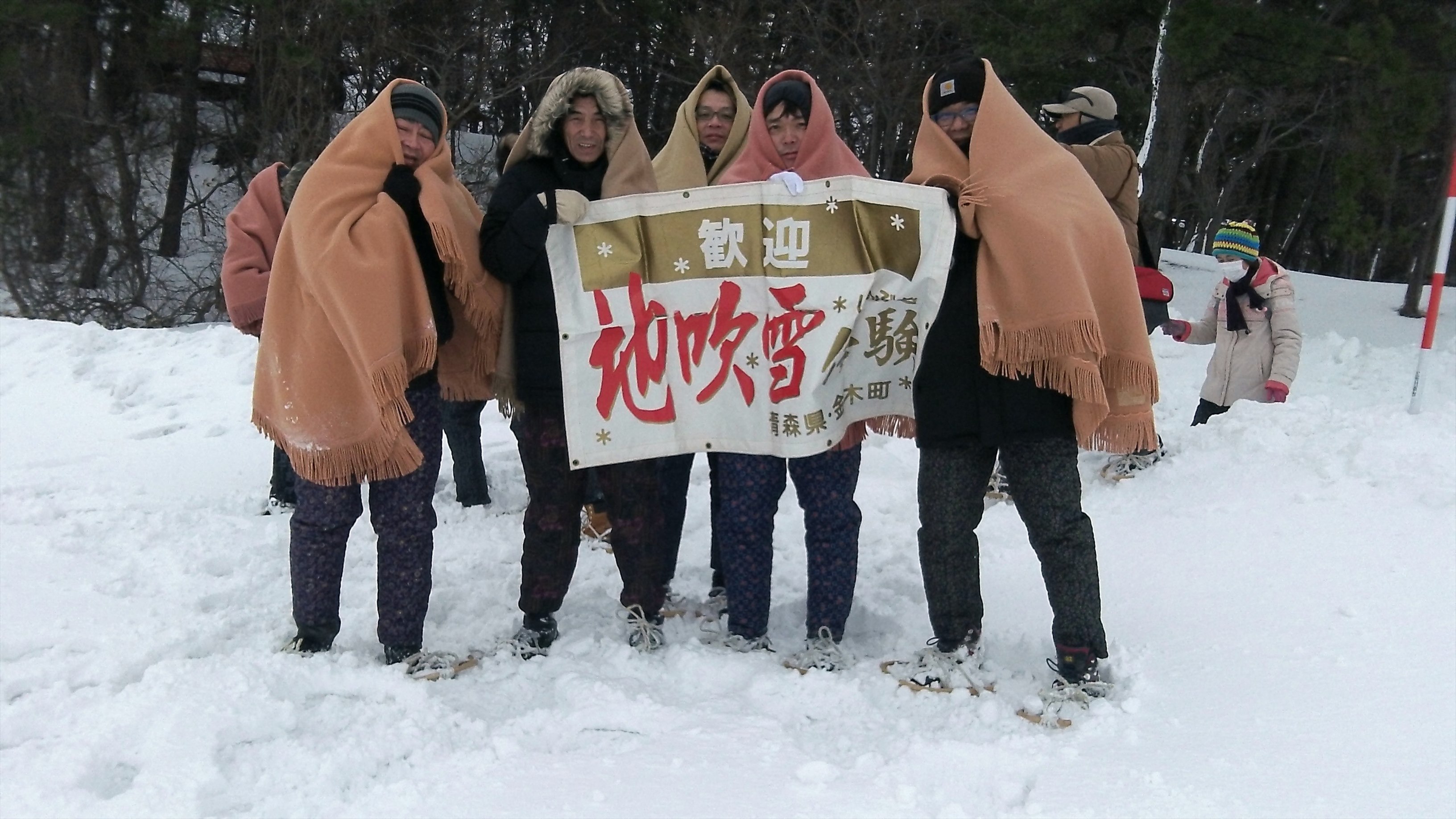 地吹雪の到来を待って、田んぼの中でウロウロするが、待てど暮らせど、シベリアおろしは一向にやってこない。結局、地吹雪を体験できないままタイムアップになった。残念だが、相手はお天気だからいたしかたない。予定では、このあと金木駅まで角巻ともんぺ姿で歩くらしい。こちらは時間がないので、ここで終了となった。