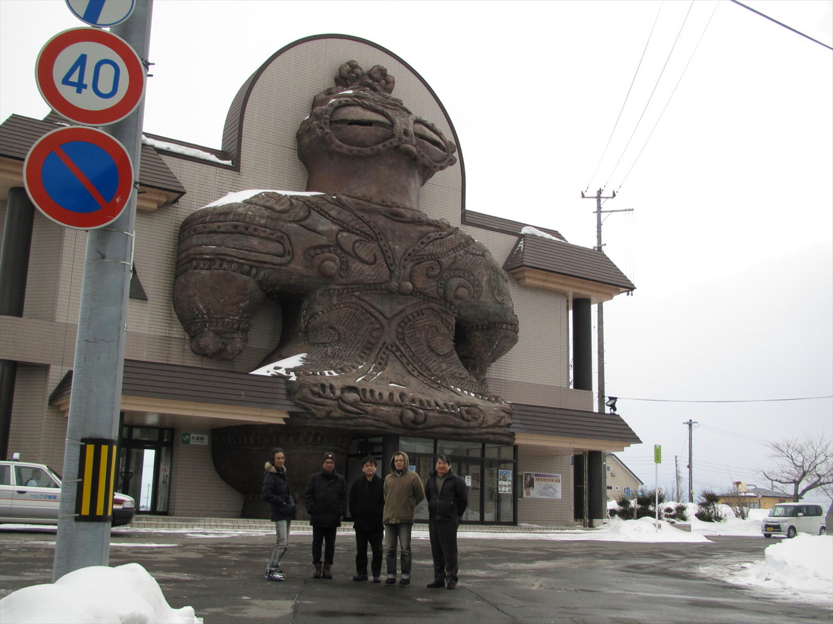 1つは、五能線の木造駅である。駅舎の正面に、巨大な土偶が張り付けてある。この土偶のオブジェは、地元の「亀ヶ岡遺跡」から出土した縄文時代の「遮光器土偶」をかたどったもので、しゃこちゃんと呼ばれている。以前は列車の発着に合わせて土偶の目を点滅させていた(いらっしゃいビーム)が、気味が悪いという理由で今は自粛している。