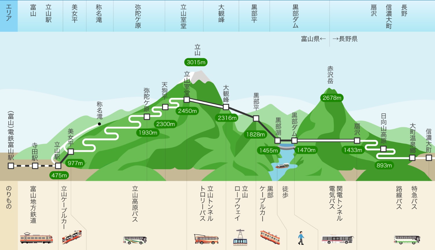 立山ロープウェイの乗り場は「大観峰」という。その名前の通り、目の前に赤沢岳の絶景が広がっている。このロープウェイはワンスパンロープウェイといい、支柱がない。出発から到着までの距離は約1.7kmで、ワンスパンロープウェイの運行距離としては日本一だという。