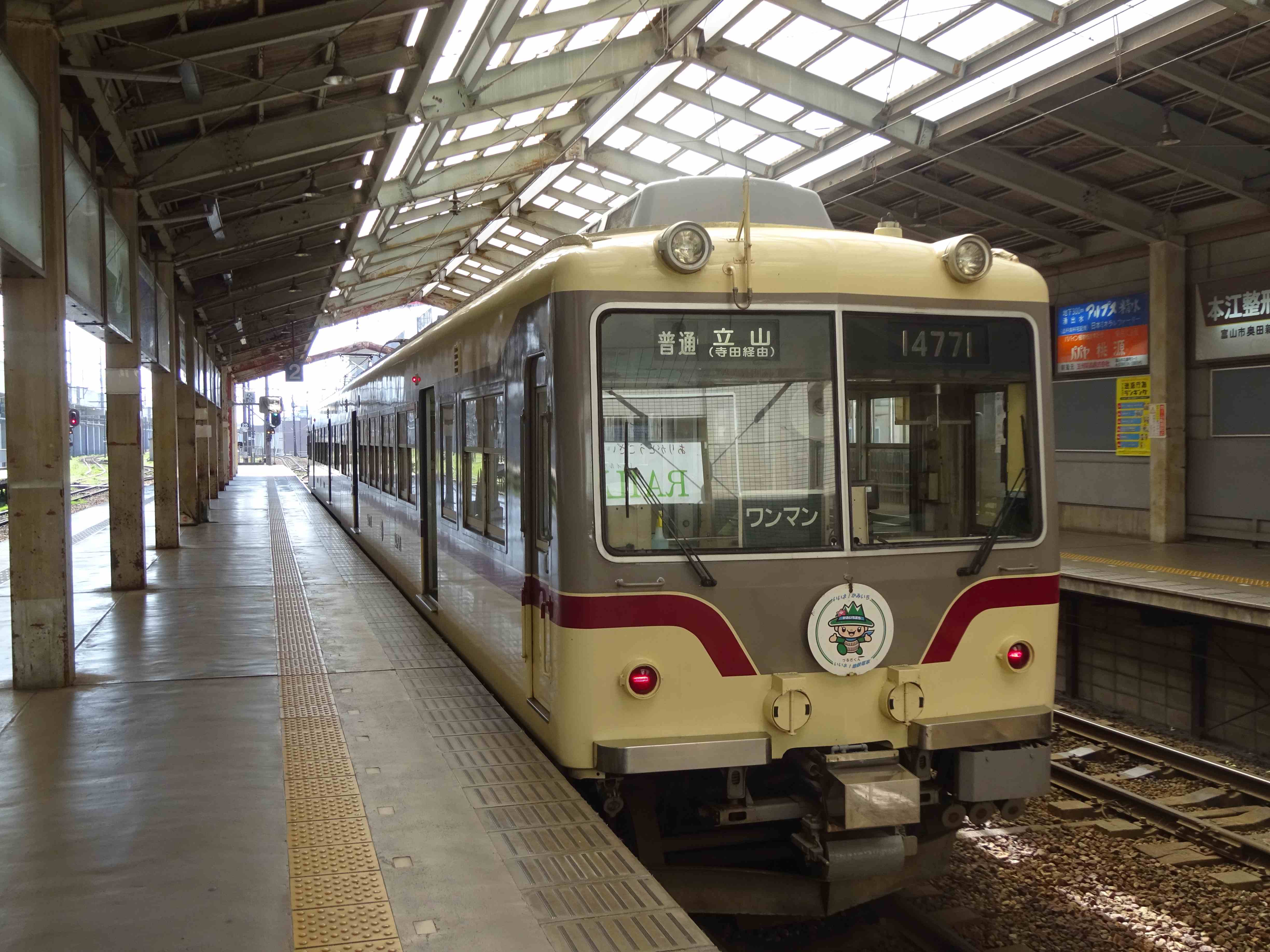 富山駅は快晴、春の日差しが眩しかった。ここで富山地方鉄道に乗り換え、立山に向かう。立山までは1時間の距離である。