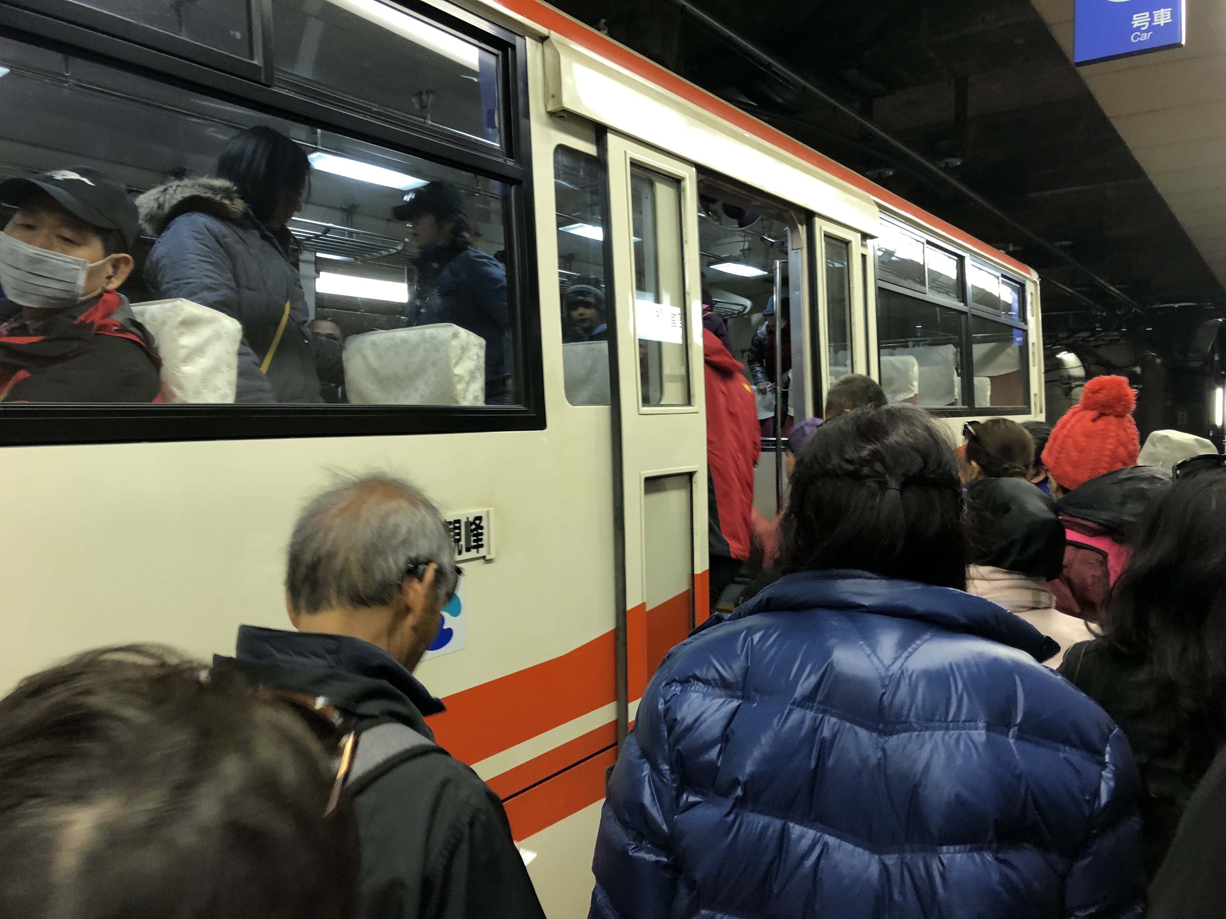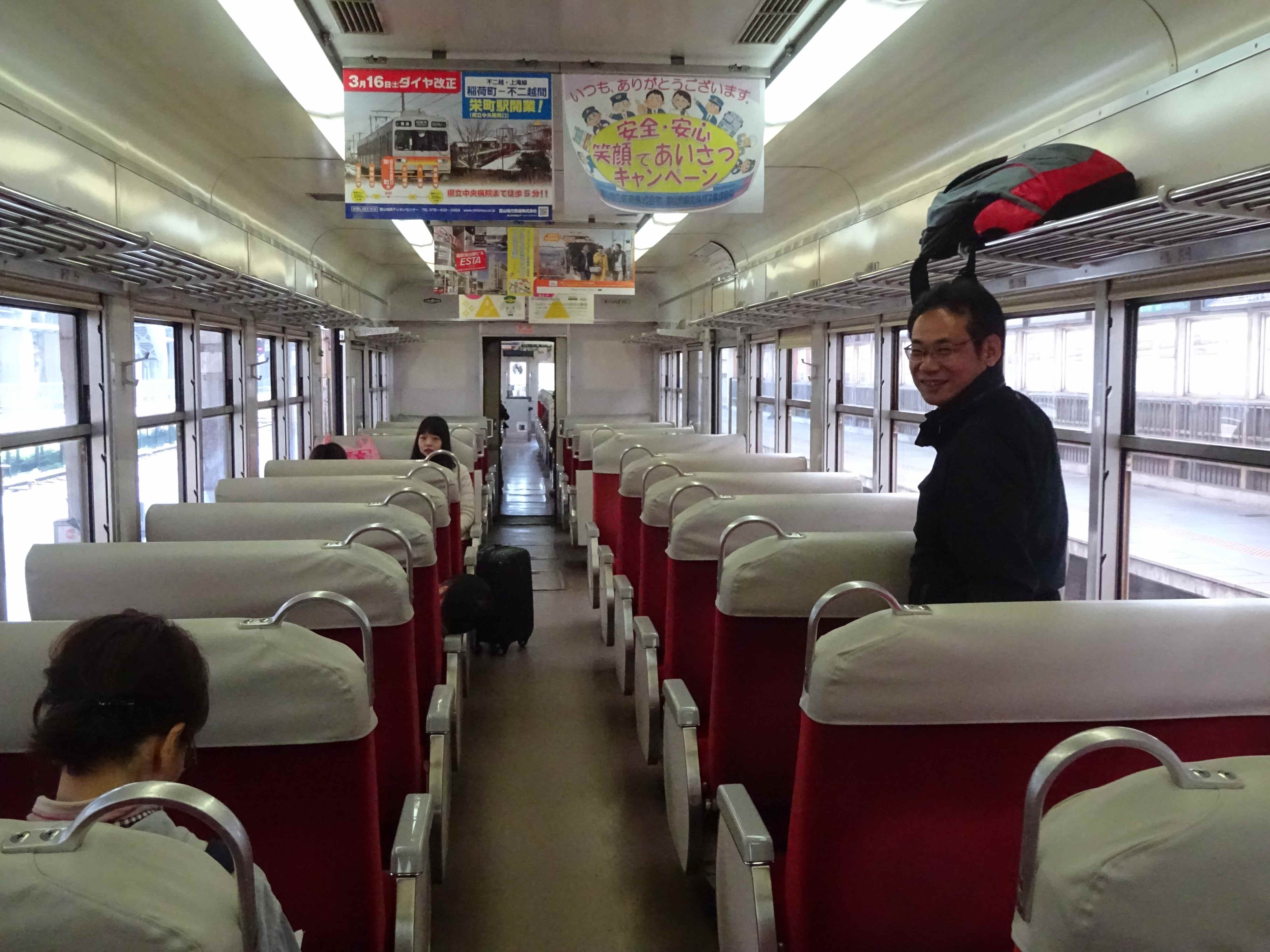 お土産売り場で酒とつまみを買い込んだ。朝の8時半なのに、「1時間あればまだ飲める」と考えてしまう。本当に困ったものだ。電鉄富山駅の改札口は外国人で混雑していた。我々の乗る電車は9時15分発なので45分も待たなければならない。近くのロッテリアで暇つぶしをしてから、再び改札口に行ってみると、誰もいなかった。電車もガラ空きだった。立山黒部アルペンルートの通り抜け切符の予約状況からいえば、こんなはずではなかった。