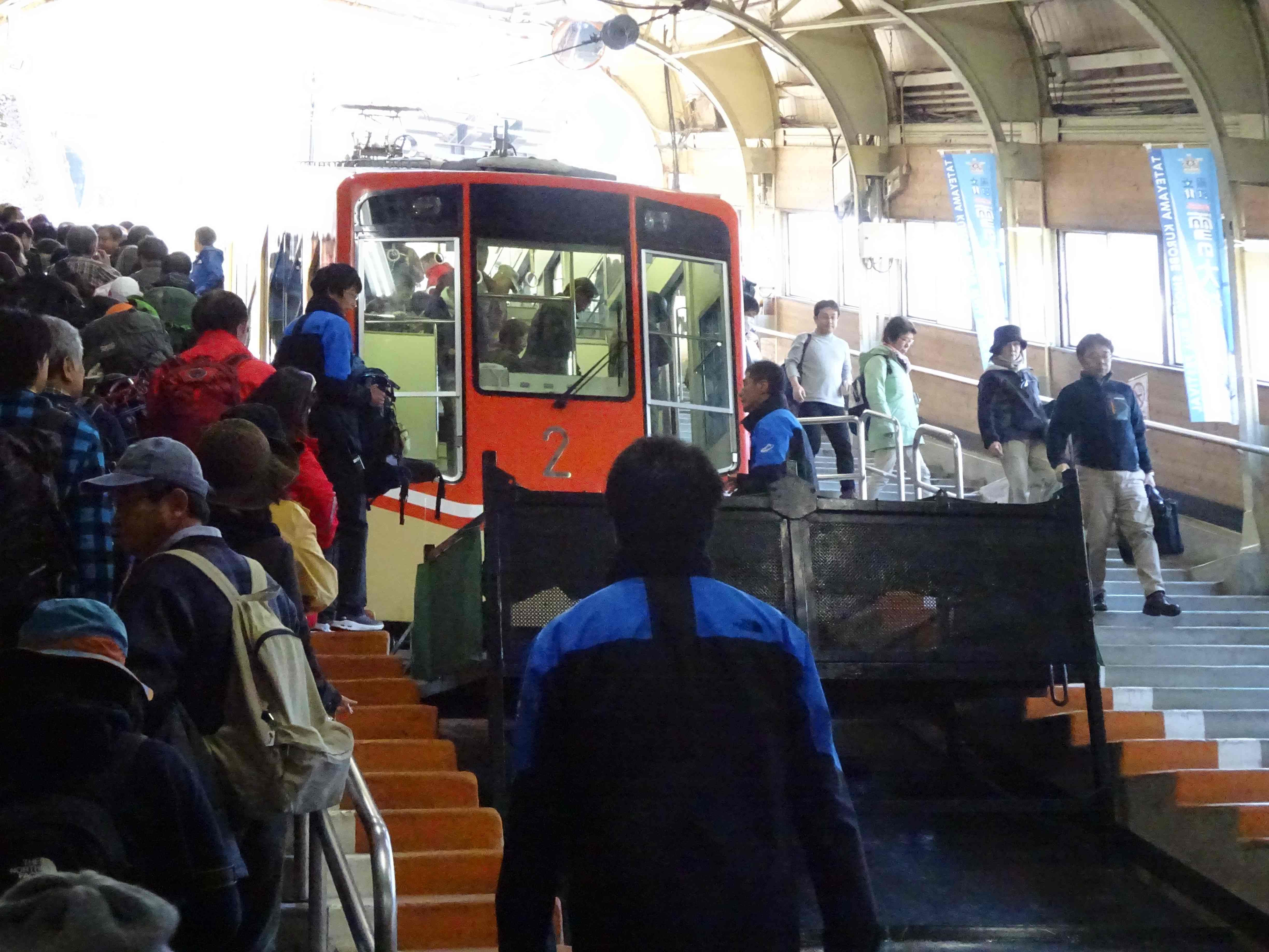 立山駅は2階が立山ケーブルカー乗り場になっている。2階に上がってみると、かなり混雑していた。電車は空いていたから、バスやマイカー客が多いのだろう。ケーブルカーの乗車時間は11時なので、ここでも40分待ちになった。