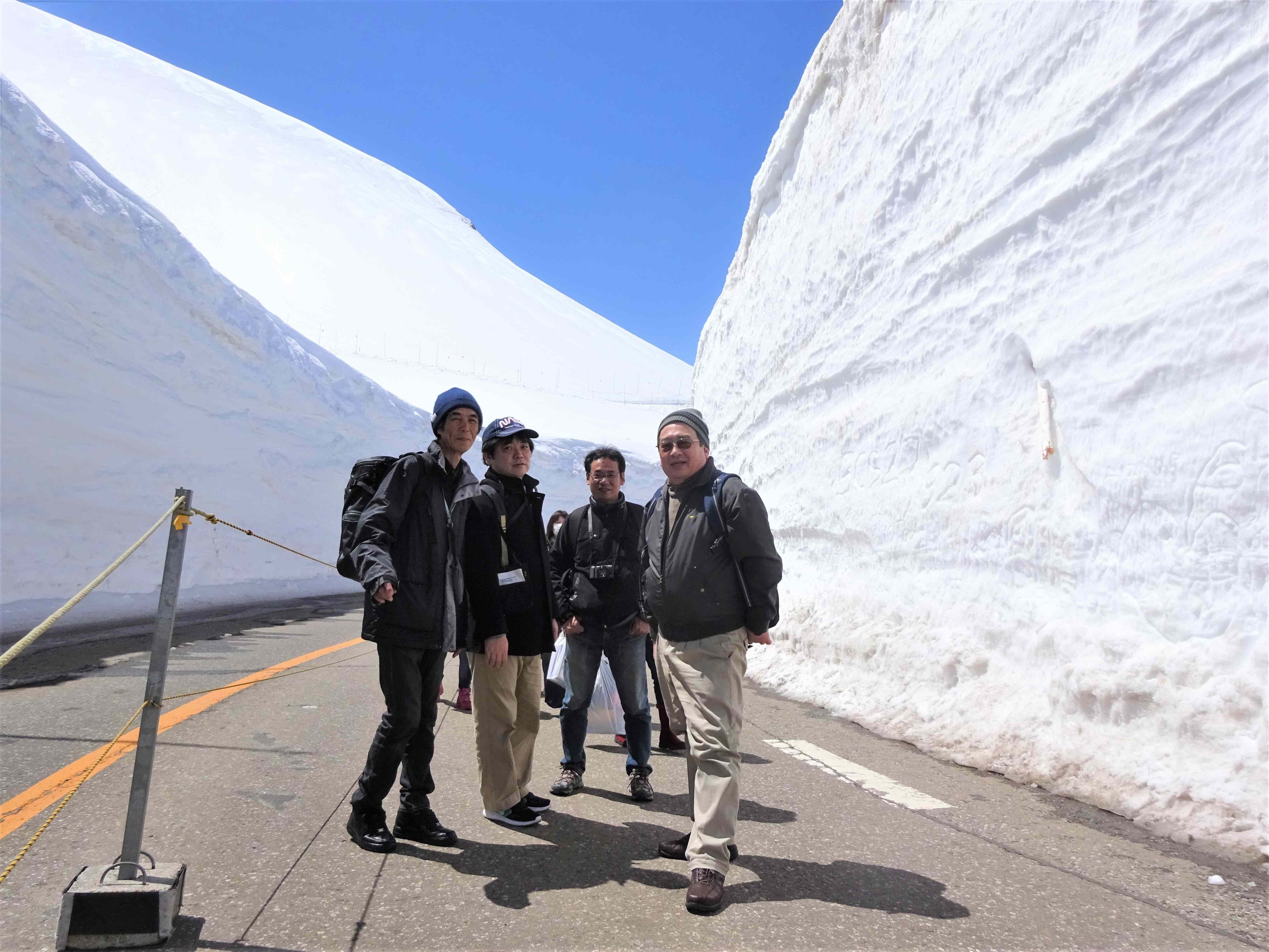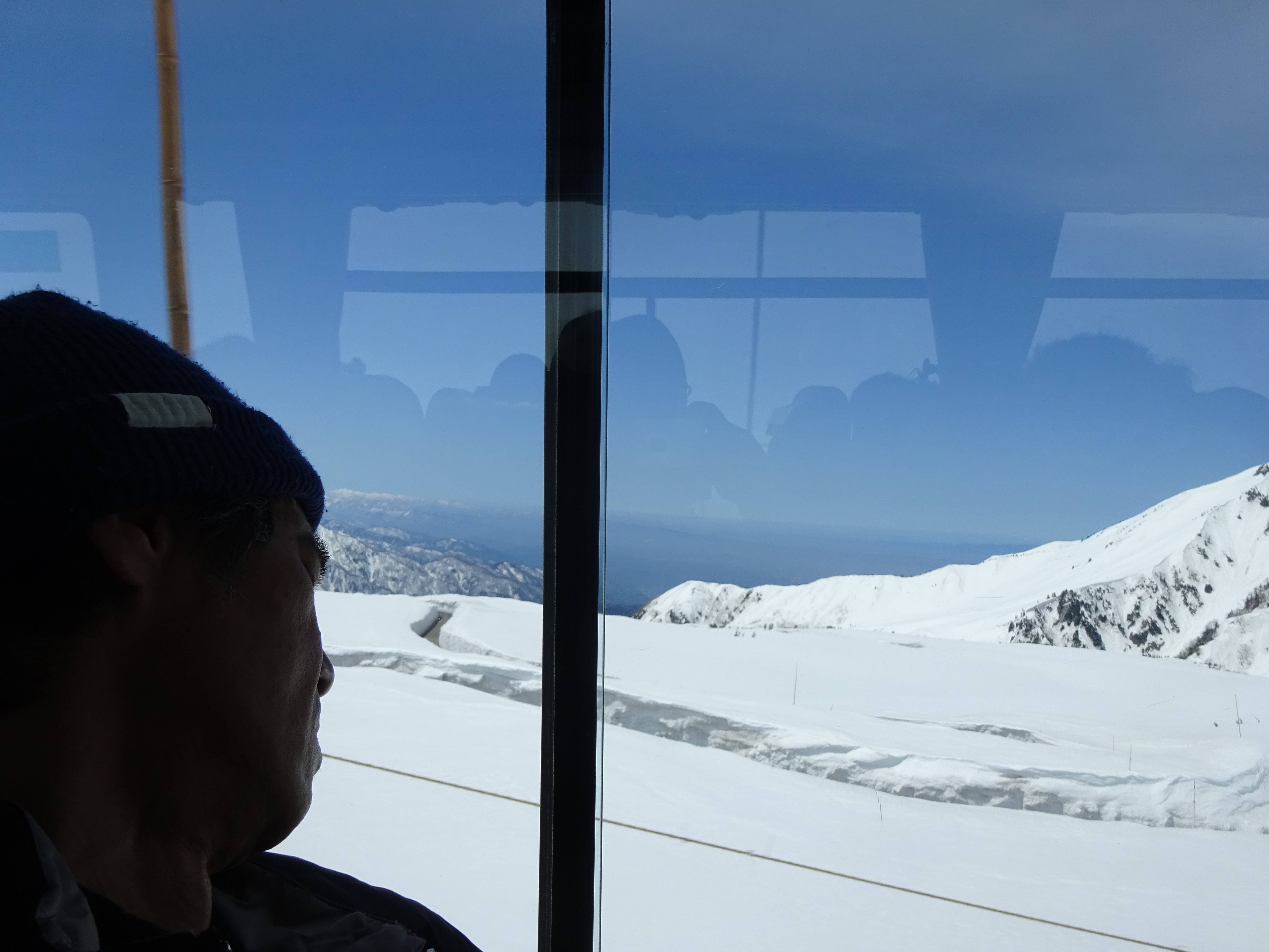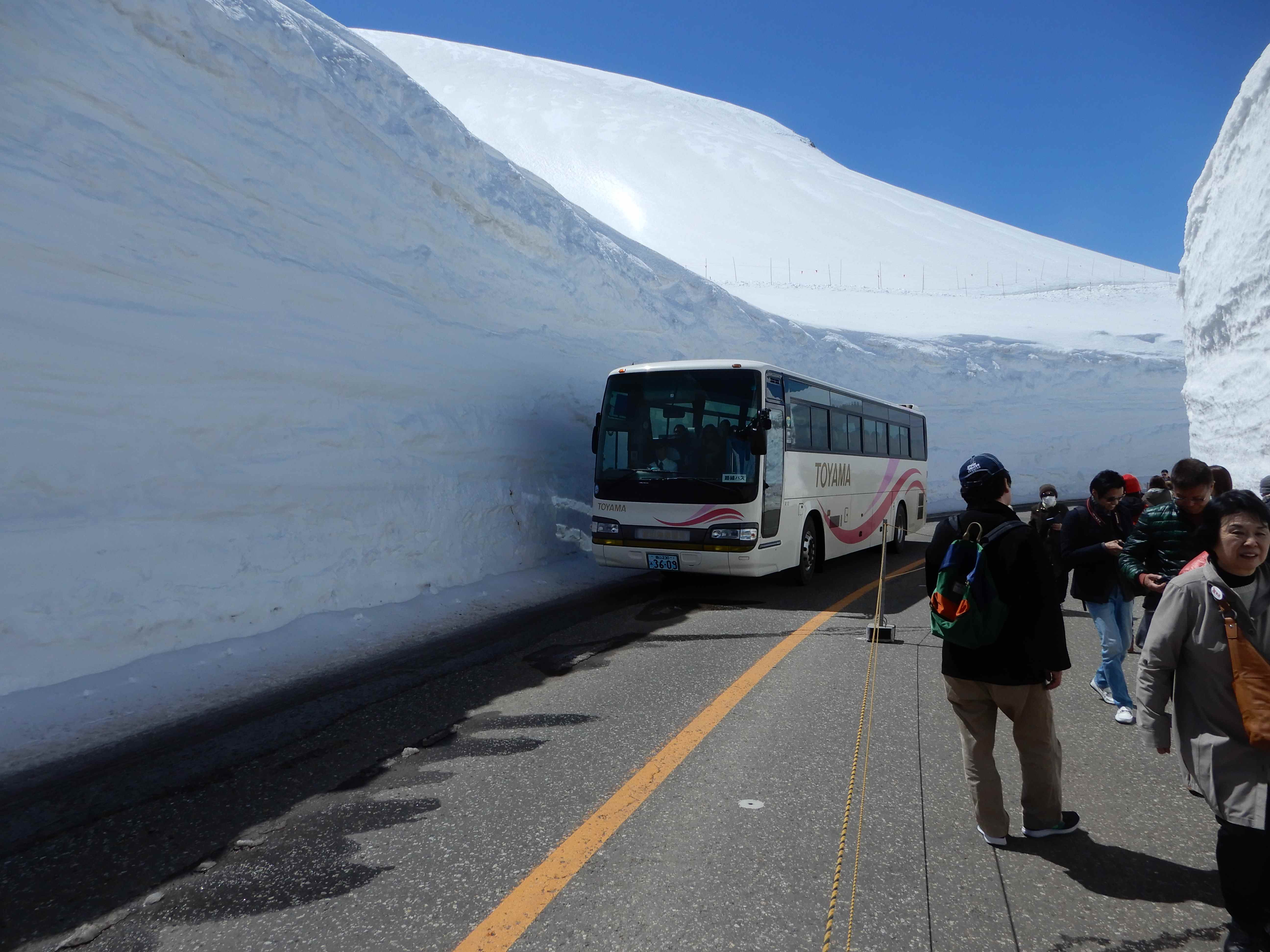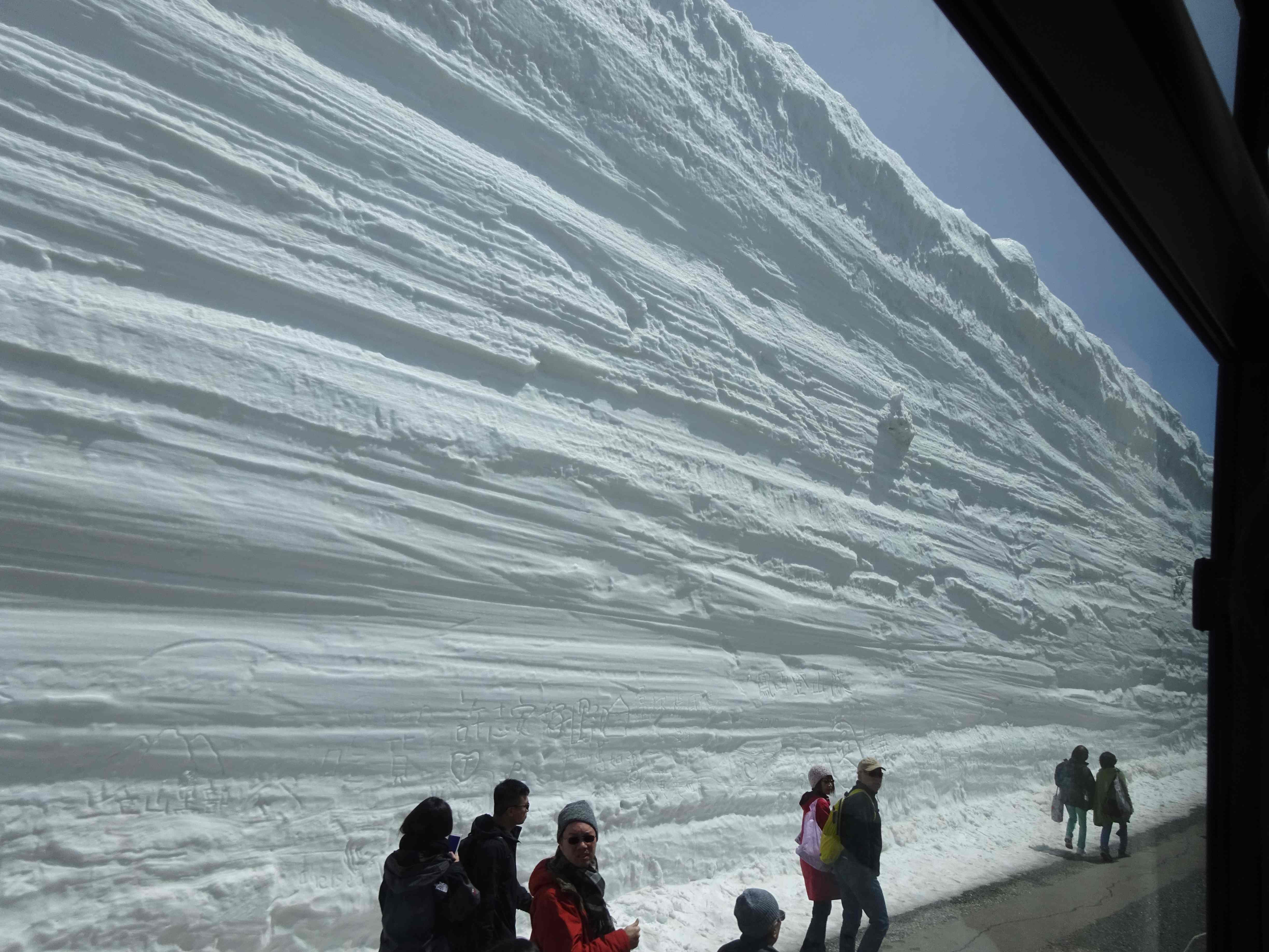 バスは50分かけて、つづら折りの山道を1500m駆け登る。睡眠不足と酒盛りのせいで、動き出すとすぐに睡魔に襲われた。終点の室堂ターミナルの手前500mにわたり、高さ20mにも迫る巨大な雪の壁がある。これが「雪の大谷」である。このあたりに来ると車内が騒がしくなり、自然に目が覚めた。外を見ると巨大な雪の壁の前に大勢の観光客がいた。