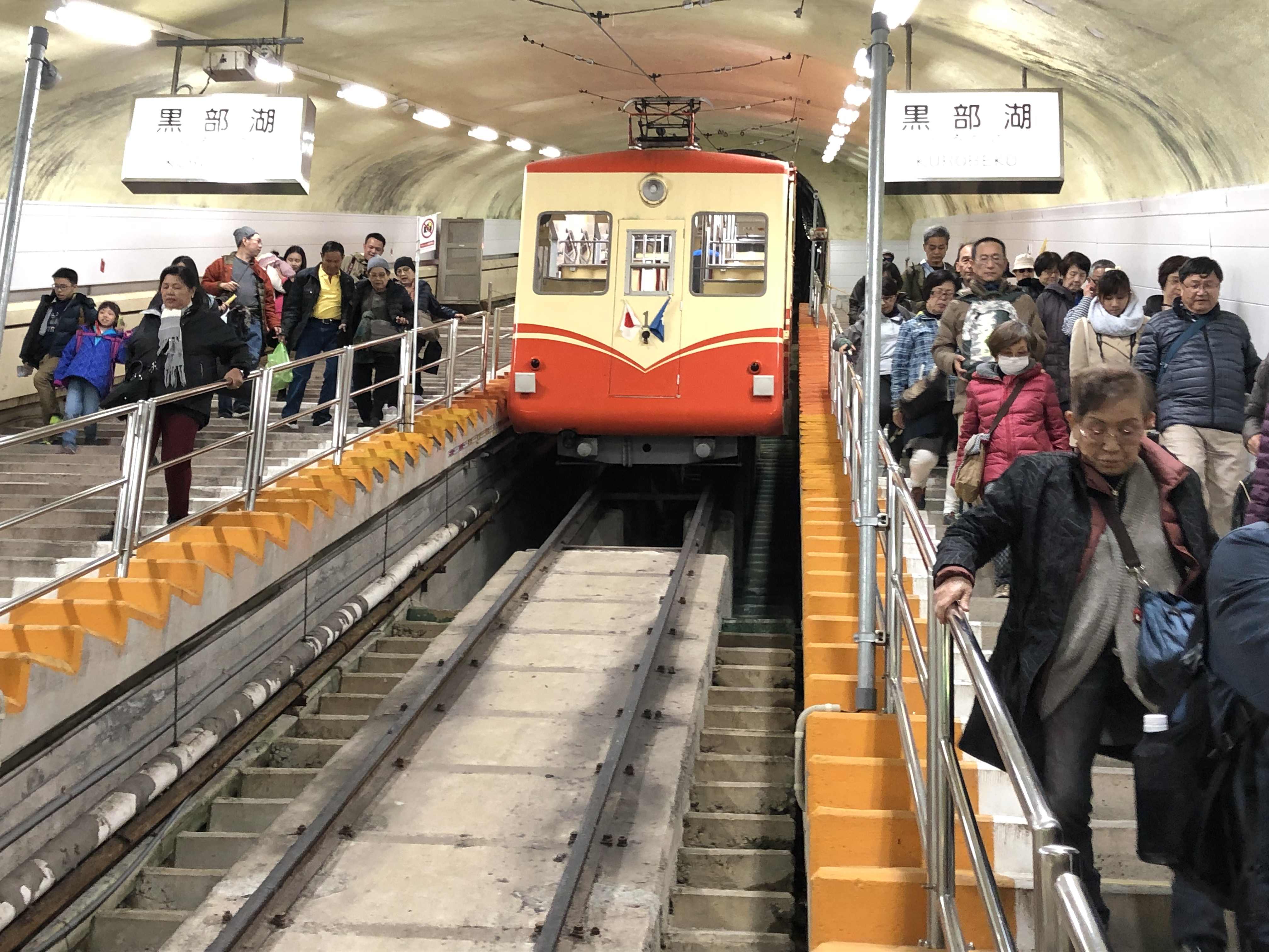 立山ケーブルカーは、立山駅と美女平間1.3km、標高差およそ500mを7分かけて一気にのぼる。車窓から柱状節理の岩肌を見ることができると車内放送があった。残念ながら、窓の外を見れる位置に乗ることができず、見えたのは人の頭だけだった。