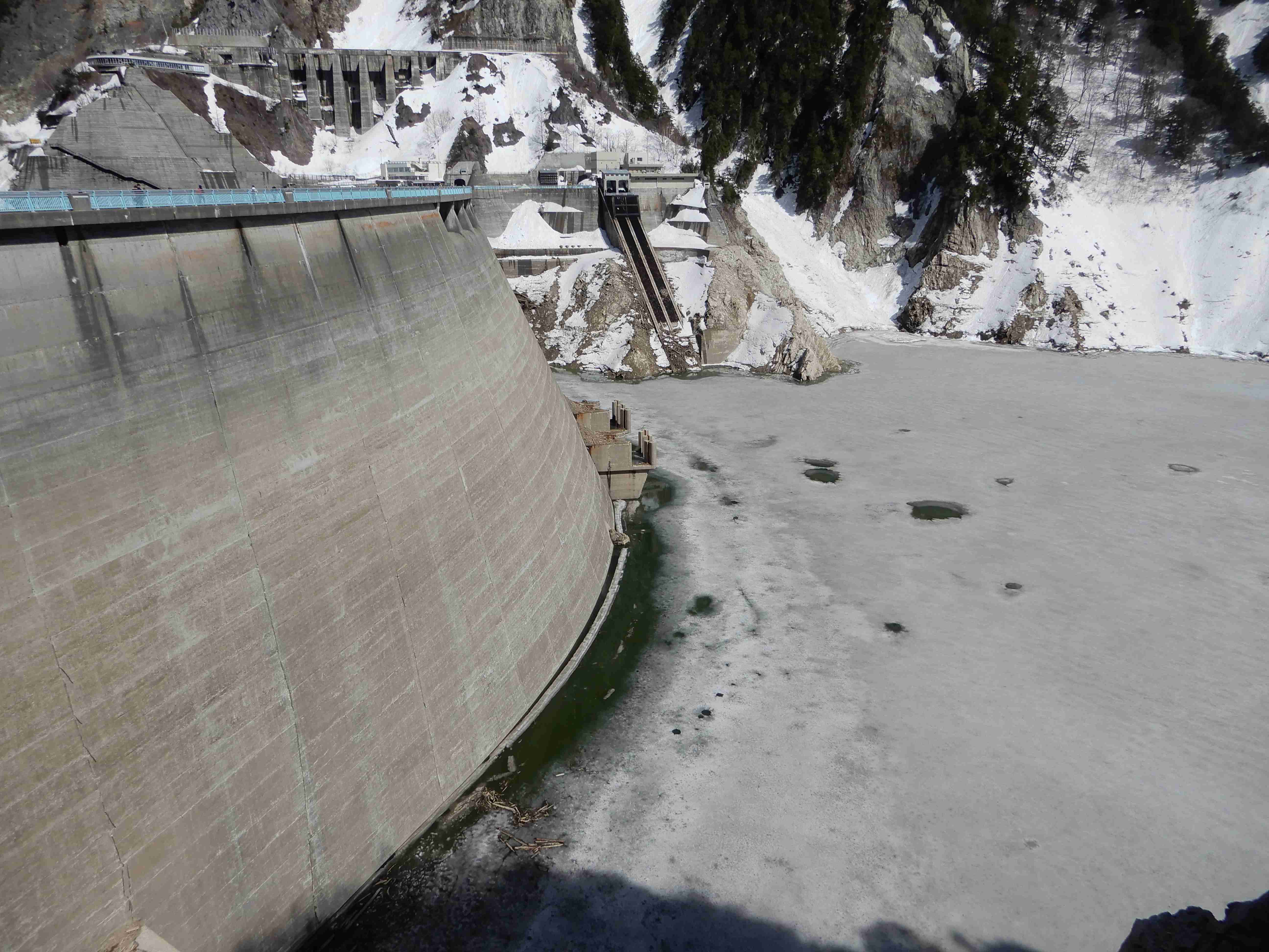 乗車時間は7分間だが、ここでも窓の近くに行けなかった。見上げると、山の急斜面にはスキーの跡が幾筋も残っていた。このあたりは山岳スキーのルートではないはずだが、強者はいるらしい。また、右側の車窓に黒部湖が見えていたのだが、まったく気づかなかった。凍りついていて、湖に見えなかったからだ。
