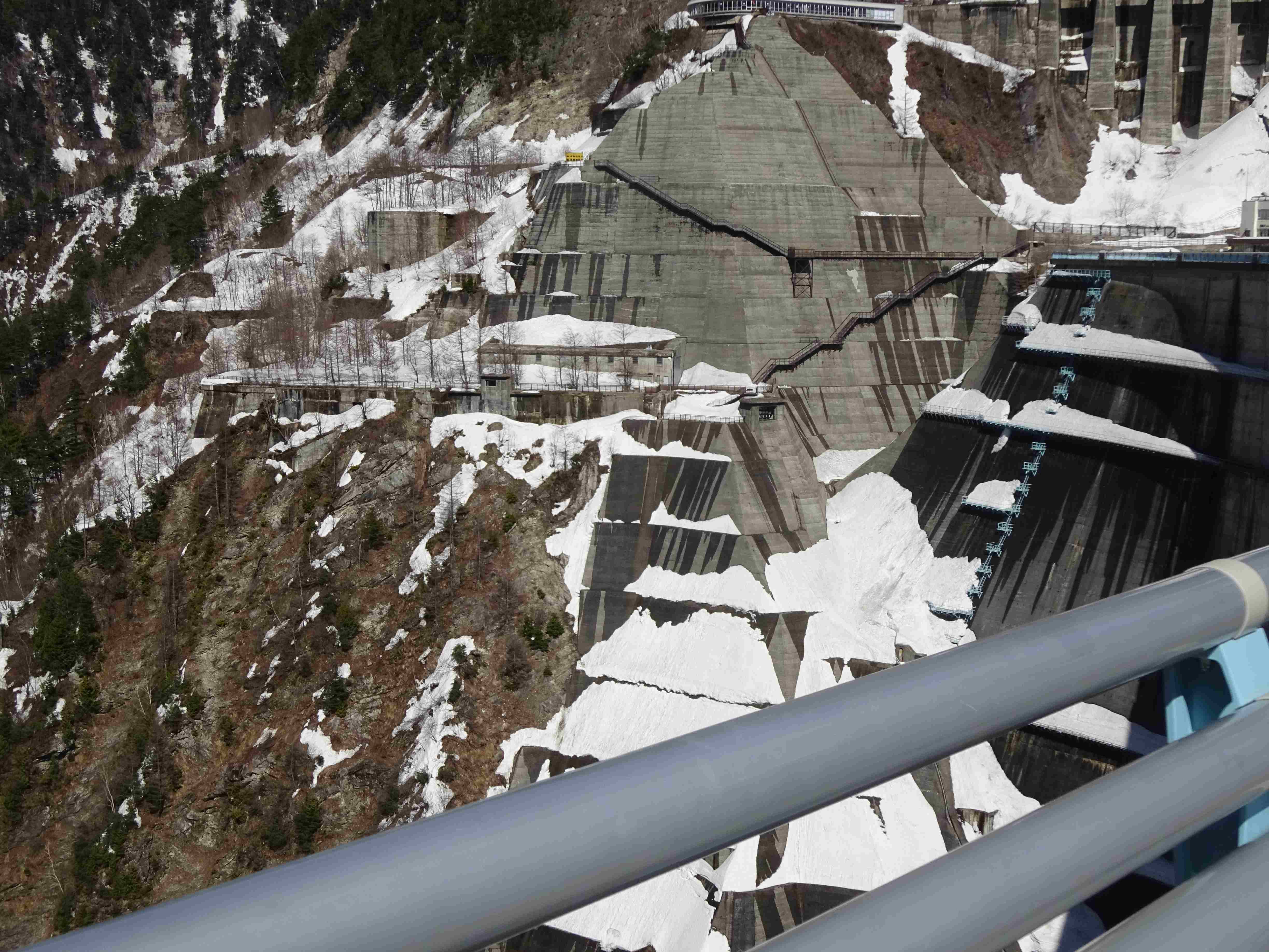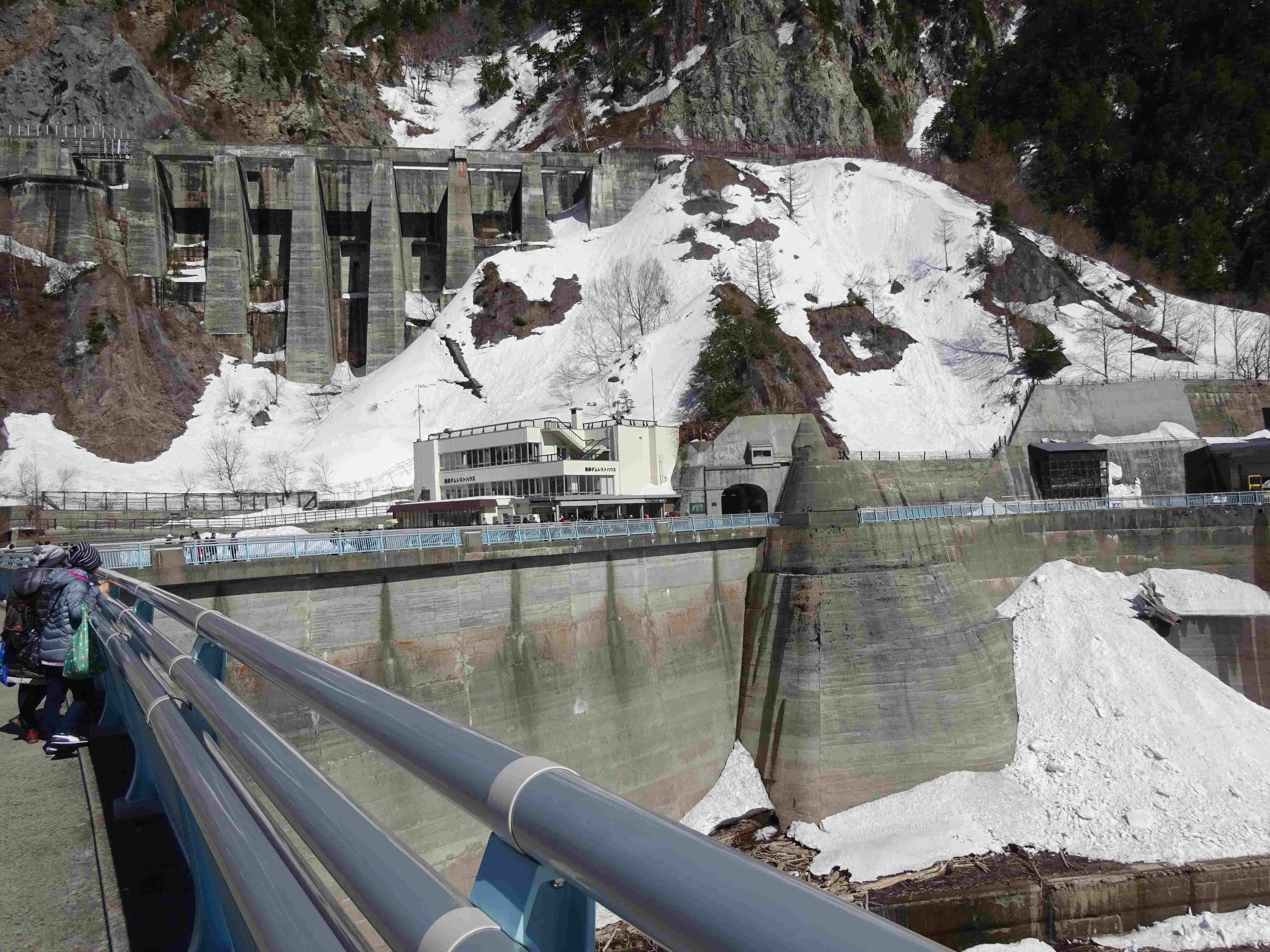 えん堤の中ぐらいまで来ると、黒部ダムの施設が目に入ってきた。正面に「黒部ダムレストハウス」が見えた。黒部ダムカレーはここの名物だった。その隣にあるのが、「黒部の太陽」で有名になった「関電トンネル」の入口である。さらに、その隣には171名の殉職者の名前を刻んだ慰霊碑があるはずだが、確認できなかった。どうやら、雪囲いされているところがそれらしい。