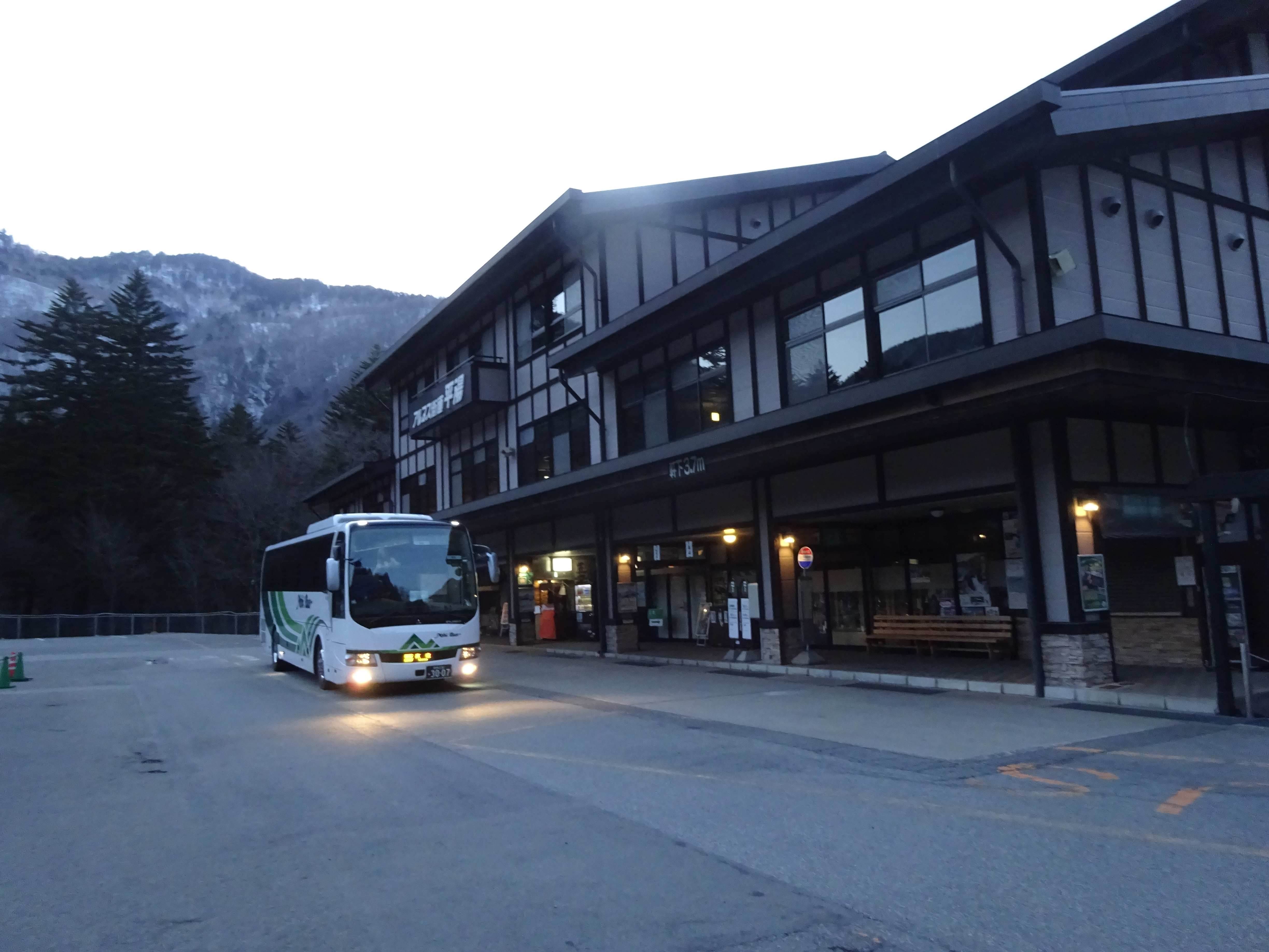 バスは大町市内を大糸線と並走し、何故か、安曇野ICから長野自動車道に乗った。これは諏訪湖に向かう道で方向が違う。変だなと思ったら、トイレ休憩が目的で、梓川SAに立ち寄っただけで次の松本ICで長野自動車道を降りた。松本からは梓川沿いを上高地に向かい、上高地の先で安房峠道路に入った。1998年の長野オリンピックのために造られたバイパス道路で、5時間以上かかっていた安房峠越えをわずか5分に短縮させた道である。安房峠道路の出口のすぐ先に平湯温泉のバスターミナルがあった。あたりは薄暗く、時間は6時半を過ぎていた。