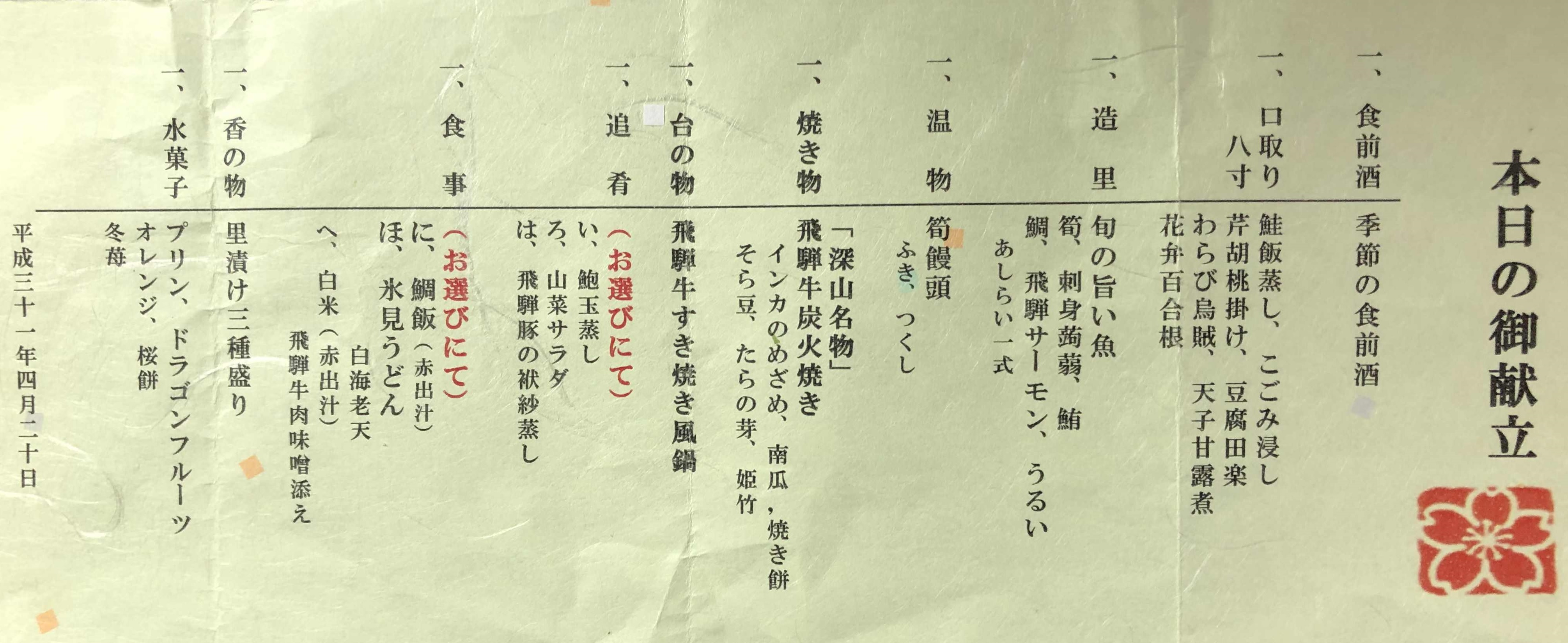 食事は飛騨牛の炭火焼きをメインにした会席料理。小鍋のすき焼きは温泉卵で食べる趣向で、卵が絡まず美味しくなかった。鯛飯も水っぽかった。それ以外は美味しかったように思う。日本酒は選ぶのに迷うくらい銘柄が多かったが、値段はどれも1合千円以上で、注文するのに少し躊躇した。銘柄を変えて4合注文したが、いずれの酒も悪くはなかった。ただ、朝から酒浸りだったせいもあって、あまり進まなかった。
