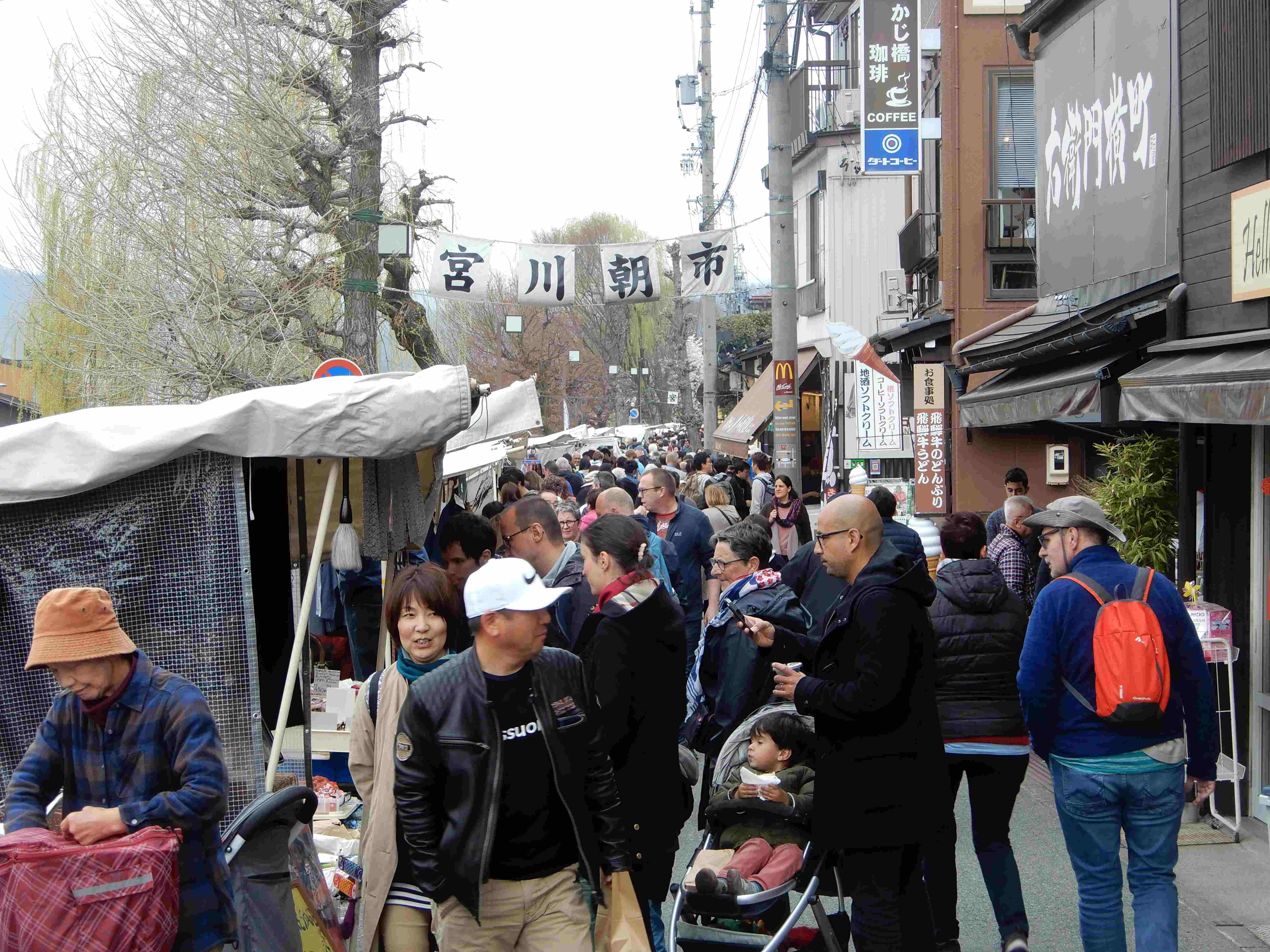 高山駅から国分寺通りを歩いて宮川朝市に向かった。雪を防ぐためなのか、アーケードが設けられていてとても雰囲気がいい。アーケードを抜けた先に、朝市のテントが見えてきた。日本三大朝市のひとつで、高山市を代表する観光名所である。海産物はなく、野菜、乾物、雑貨が中心である。ここにも外国人が多く集まり、一体ここで何を買うつもりなのか、とても不思議な気がした。