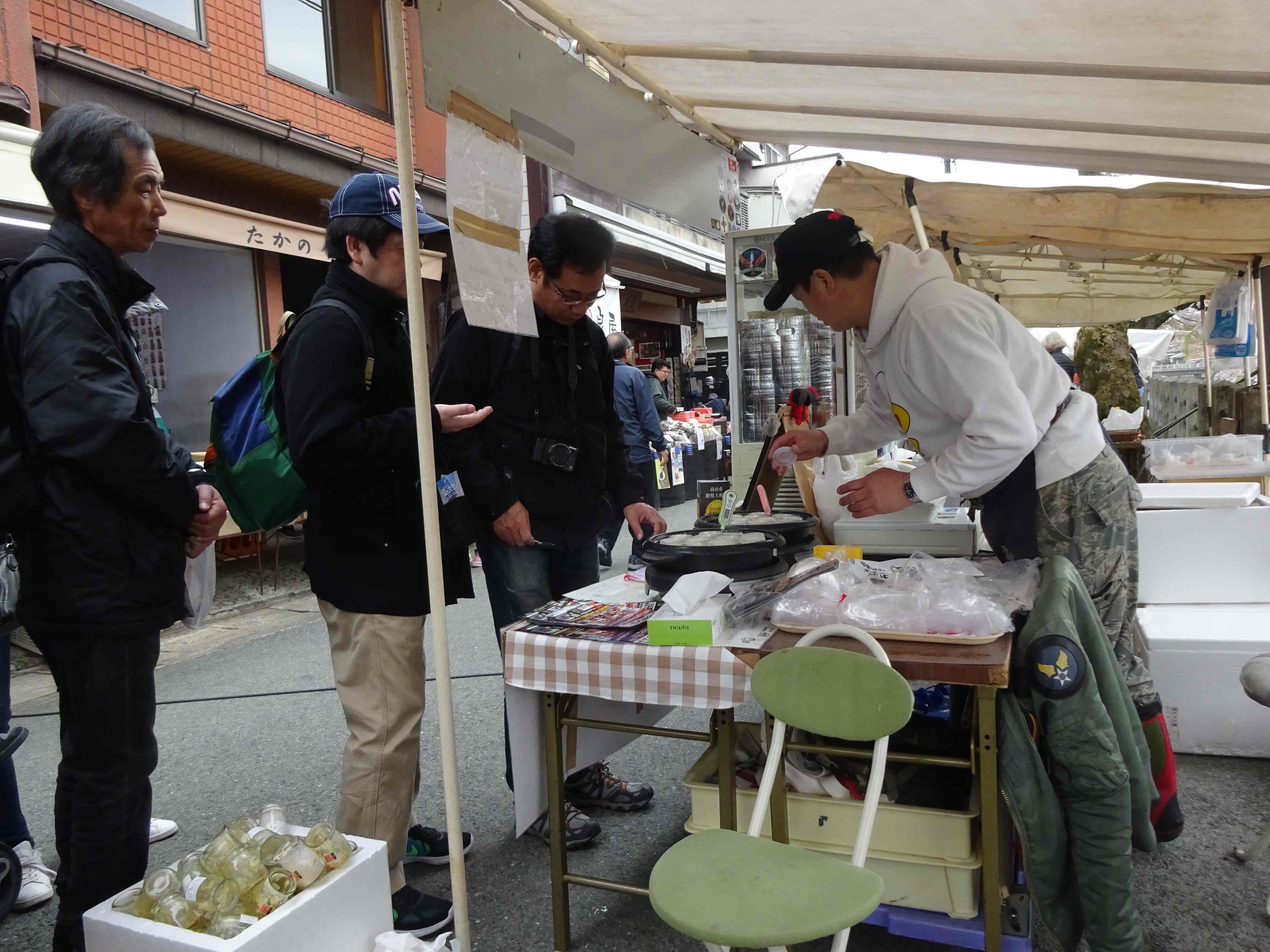 外国人にとり囲まれていたのが「コマコーヒー」、クッキーでできたコーヒーカップに自家焙煎のエスプレッソ、人が多くて近寄れず。「飛騨牛の握り」、まだ時間が早いとパス、後で後悔。いろいろな種類の切り餅、その中から「昆布餅350円」を購入、お土産に。大袈裟な名前の牛乳に遭遇、「まぼろしの朝市牛乳 白い命 180円」、味が薄くて今ひとつ。一際賑わっていたのが「高山プリン350円」、湯煎したホットプリンだが味は普通。