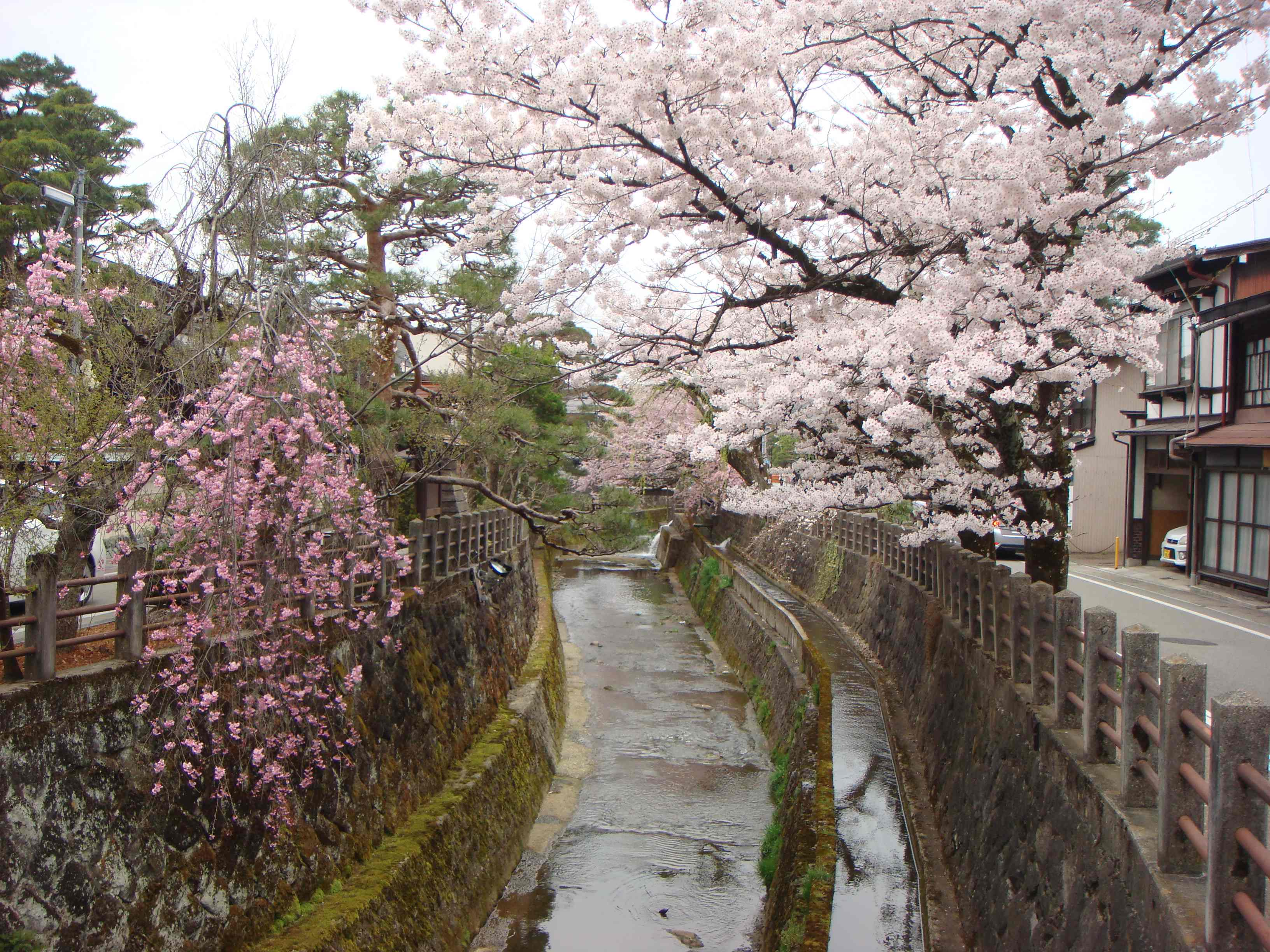 桜山八幡宮から古い町並みに向かった。途中にある、宮川の支流・江名子川沿いの風情がとてもいい。このあたりは古い町並みのハズレで人が少なく、桜も今が満開。しばし休憩。