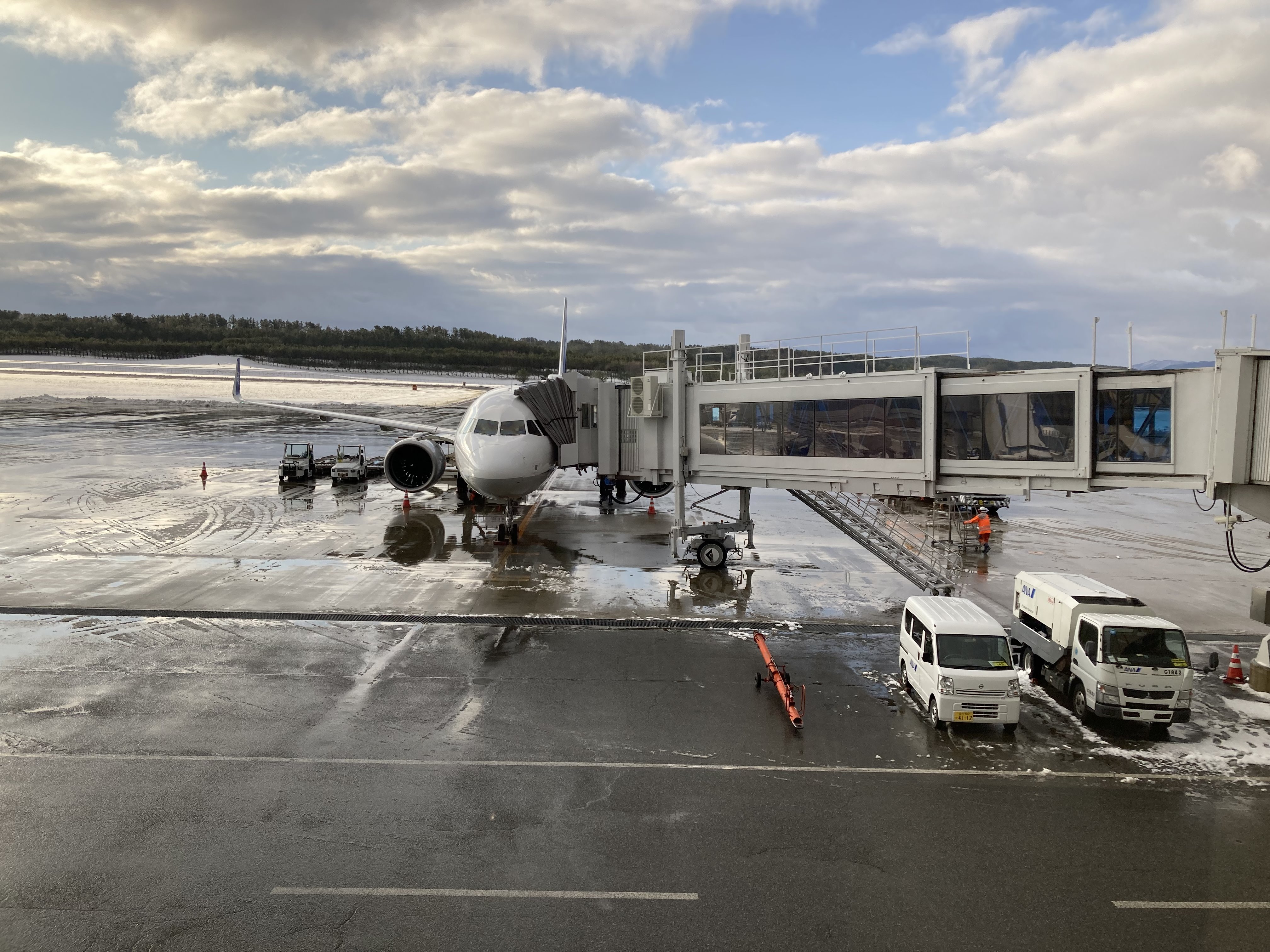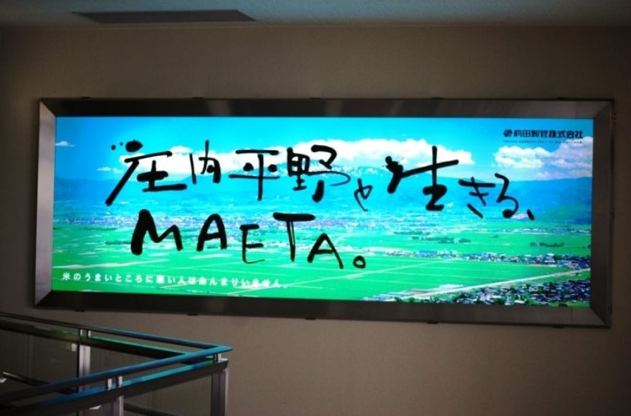 庄内空港の気温は6℃、晴天。それほど寒くない。空港ビルの1階に降りる階段のところで、「庄内平野と生きる MAETA」と書かれた大きな看板が目にとまった。下の方に「米のうまいところに悪い人はあんまりいません」と書かれていて、思わず笑ってしまった。
