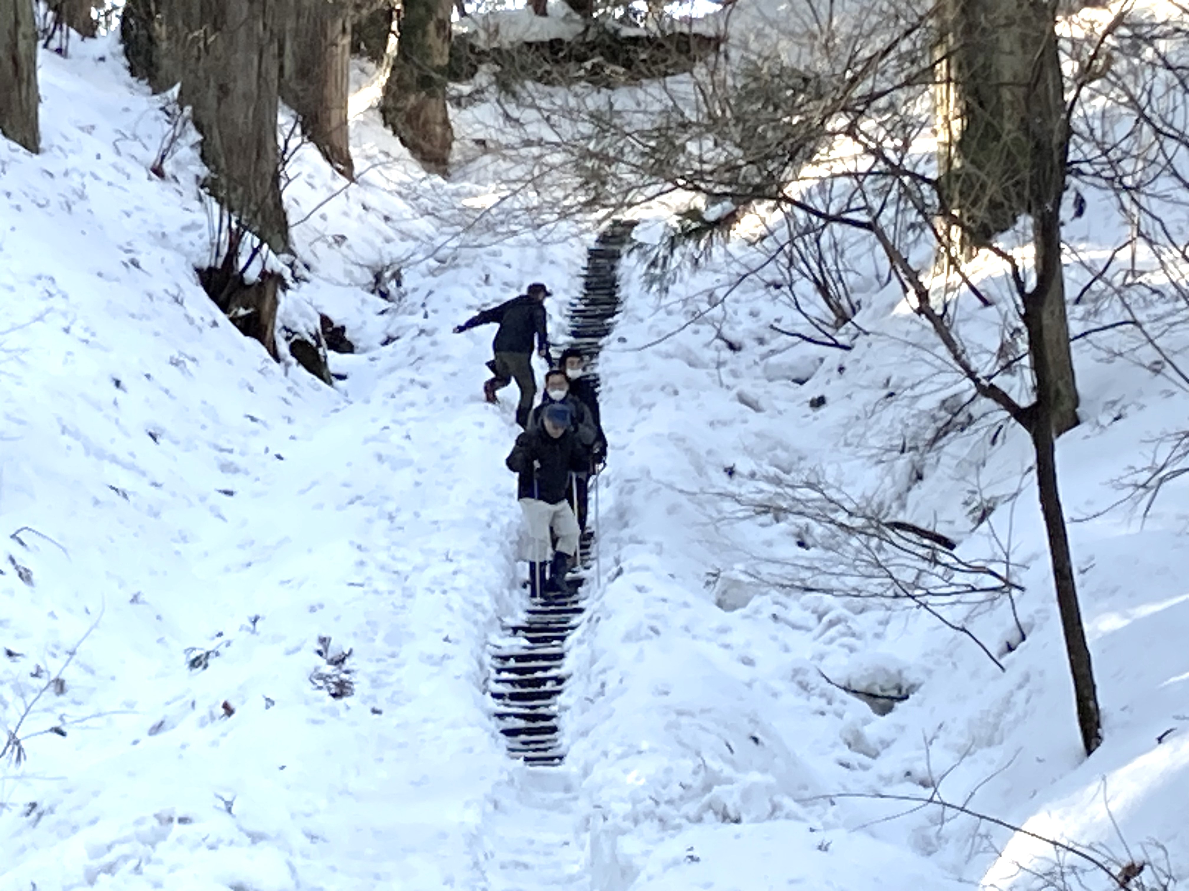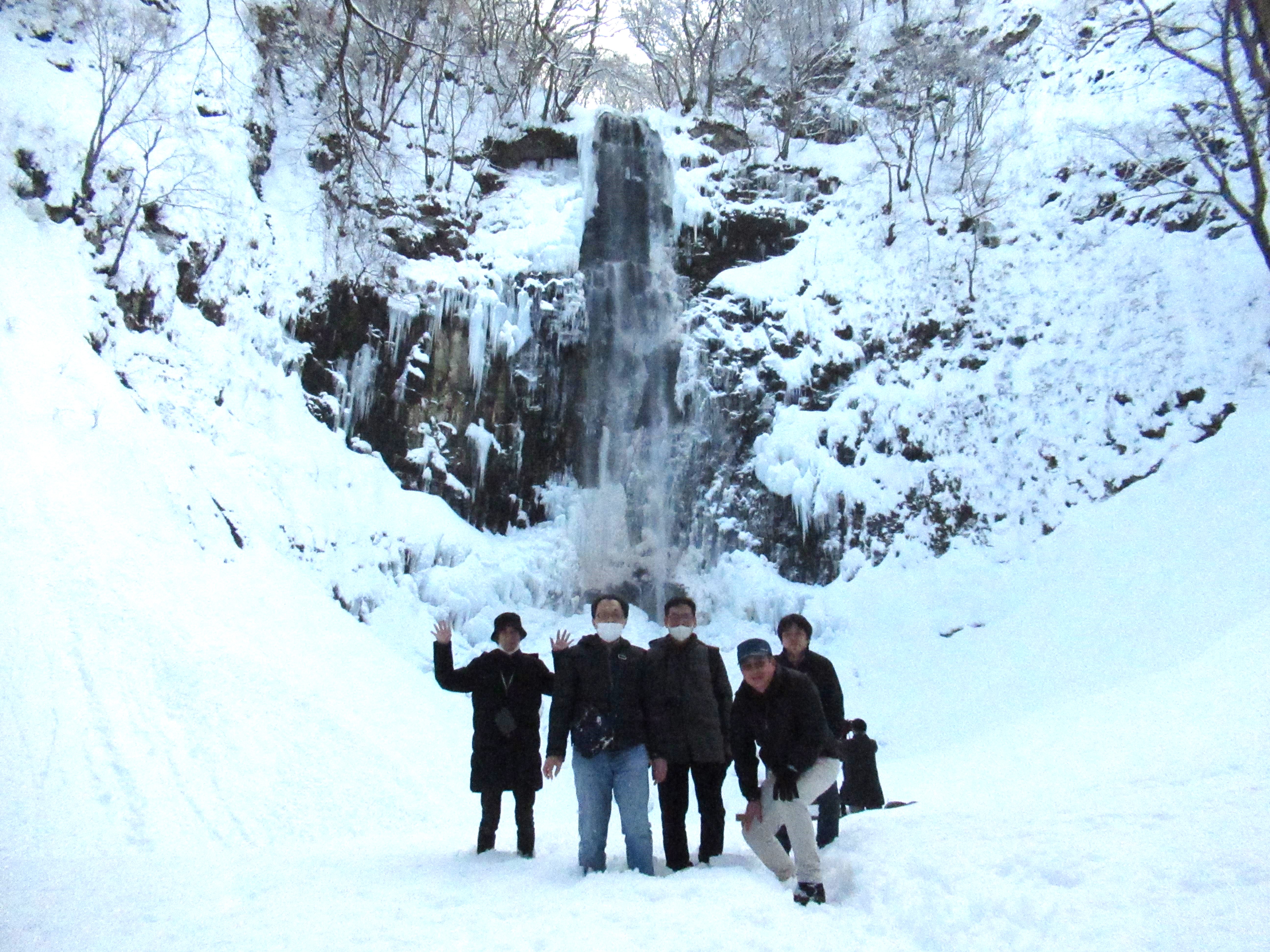 最初の目的地は幹事M君お勧めの玉簾の滝。過去に行ったことがあるようだった。旅行サイトには「滝に向かう遊歩道は除雪されておらず、かんじきが必要になる」とか書いてある。気乗りしないが、しょうがない。