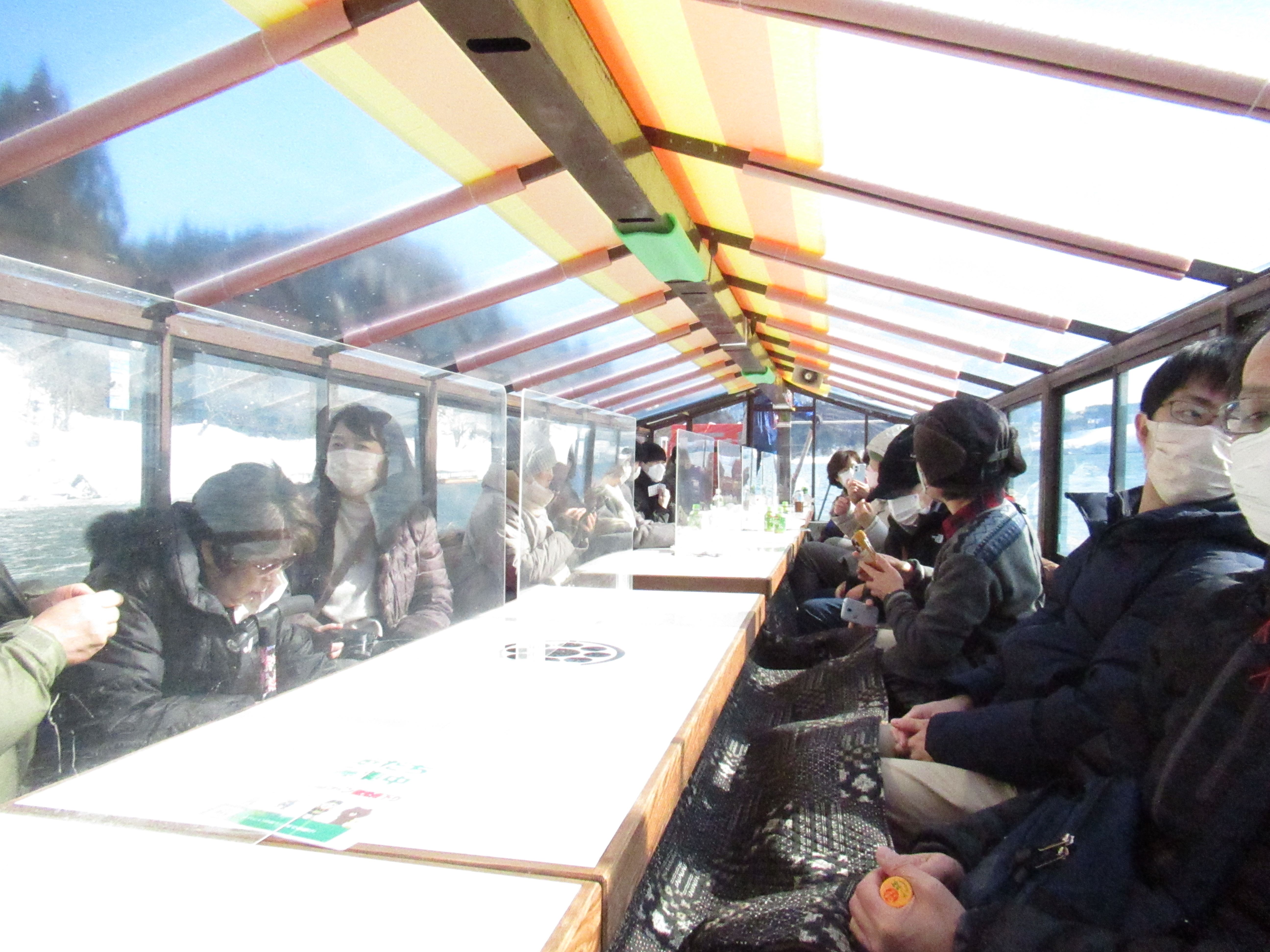 乗船場に着いたのは出航時刻の10分前で、慌ただしく船に乗り込んだ。前回と違い、屋根はビニールで覆われ、窓も取り付けられていた。加えて、コロナ対策のアクリル板。これでは、反対方向の景色は楽しめない。船内は暖房が効いていてとても暖かい。テーブルはコタツになっていたが、雰囲気だけで、あまり意味がないように思えた。