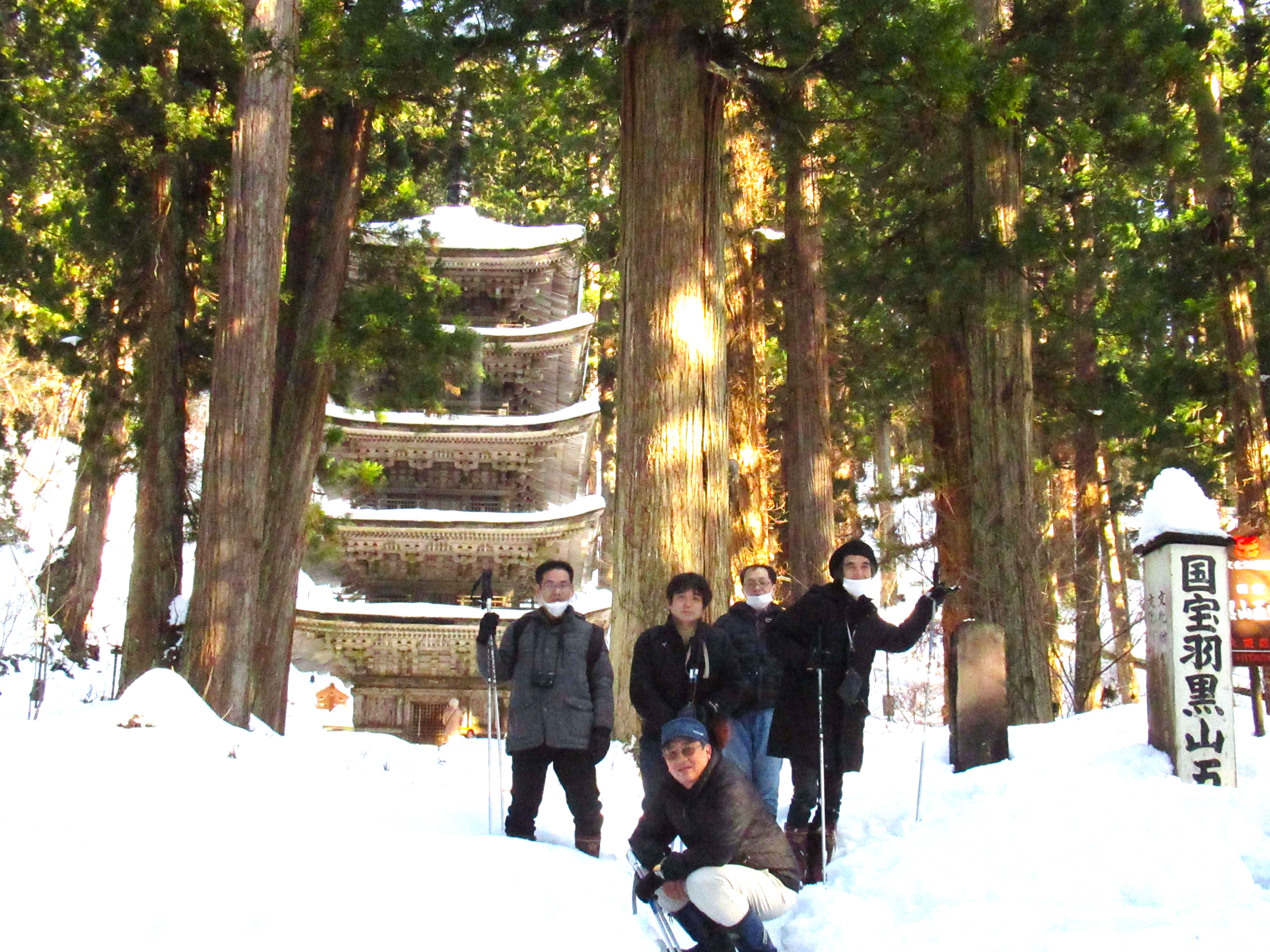 羽黒山参詣道の入り口にある赤い山門が随神門、ここから先は神の領域になる。門の先の延々と続く狭い下りの石段が危ない。所々アイスバーンになっていて、注意しないと下まで転げ落ちそうだった。石段を下り、赤い神橋を渡ったその先に、国宝・羽黒山五重塔が杉の大木の間に見えてきた。