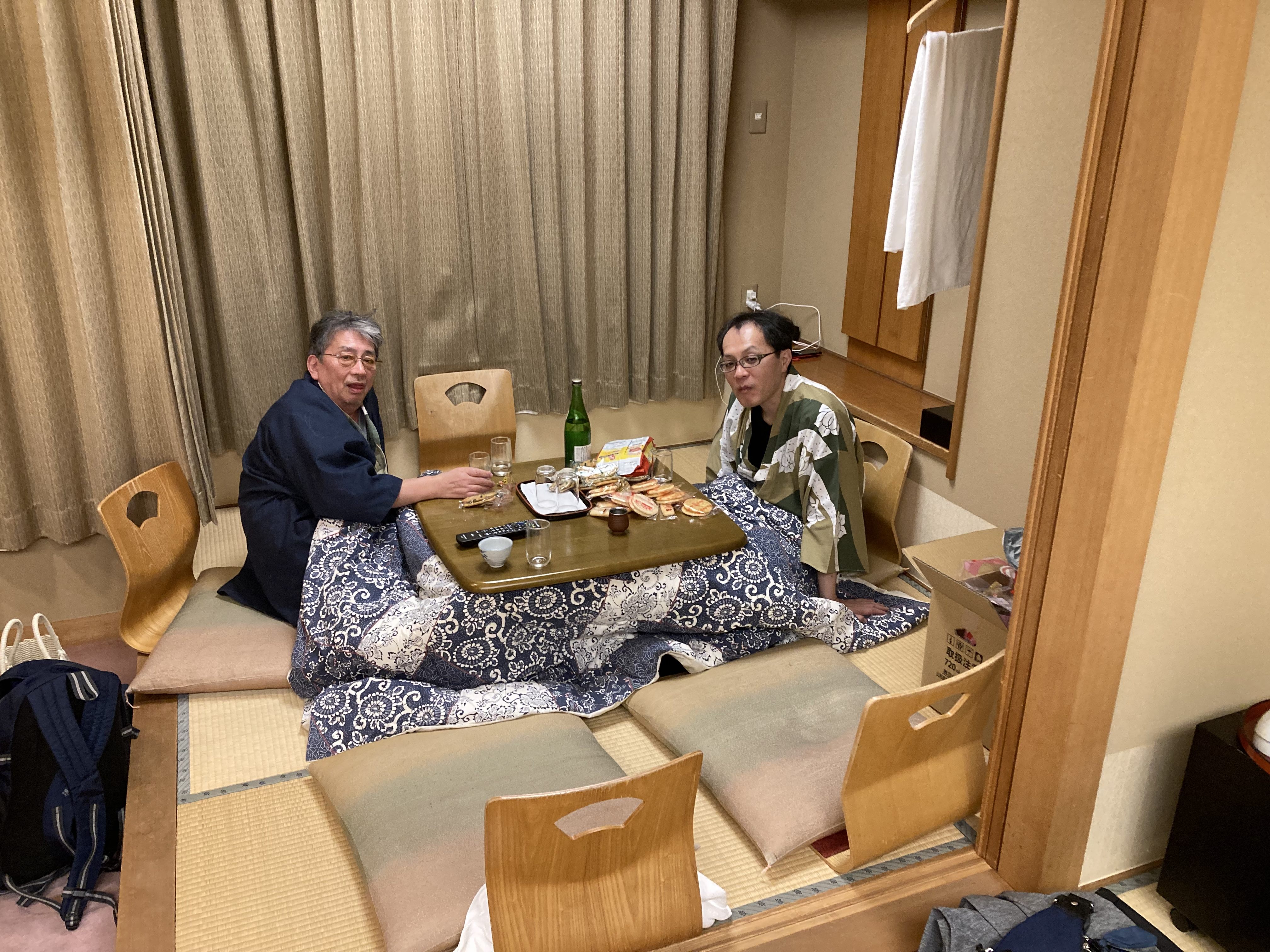 「たちばなや」は創業370年の老舗で、「プロが選ぶ日本のホテル・旅館100選」の総合20位。宿泊した部屋は、10畳の和室と広縁の他に、掘炬燵が付いた4畳半の和室が用意されていた。夕食中に布団が敷かれてしまうため、夕食後の部屋飲みができない。この4畳半はとても気が利いている。