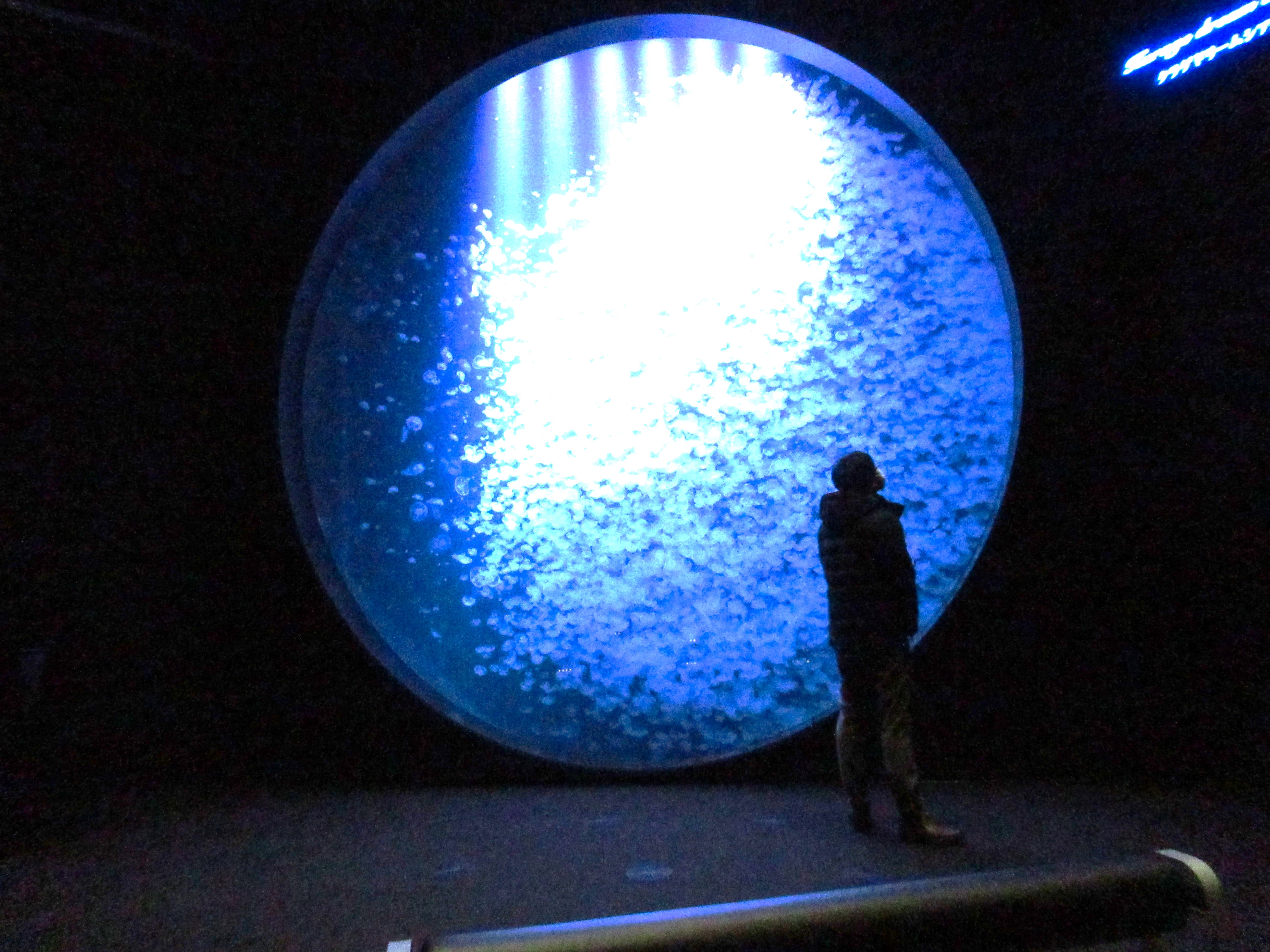 順路に従って見学をする。小さな水槽に庄内地方沖に生息する魚の展示が続き、これが意外に面白い。やがて、クラゲの展示が始まる。最初は可愛く感じられたが、進むにつれ、グロテスクになってくる。最後は大きな丸い水槽に無数のミズクラゲが浮かぶクラネタリウムに出る。写真などでよく紹介される場所だ。