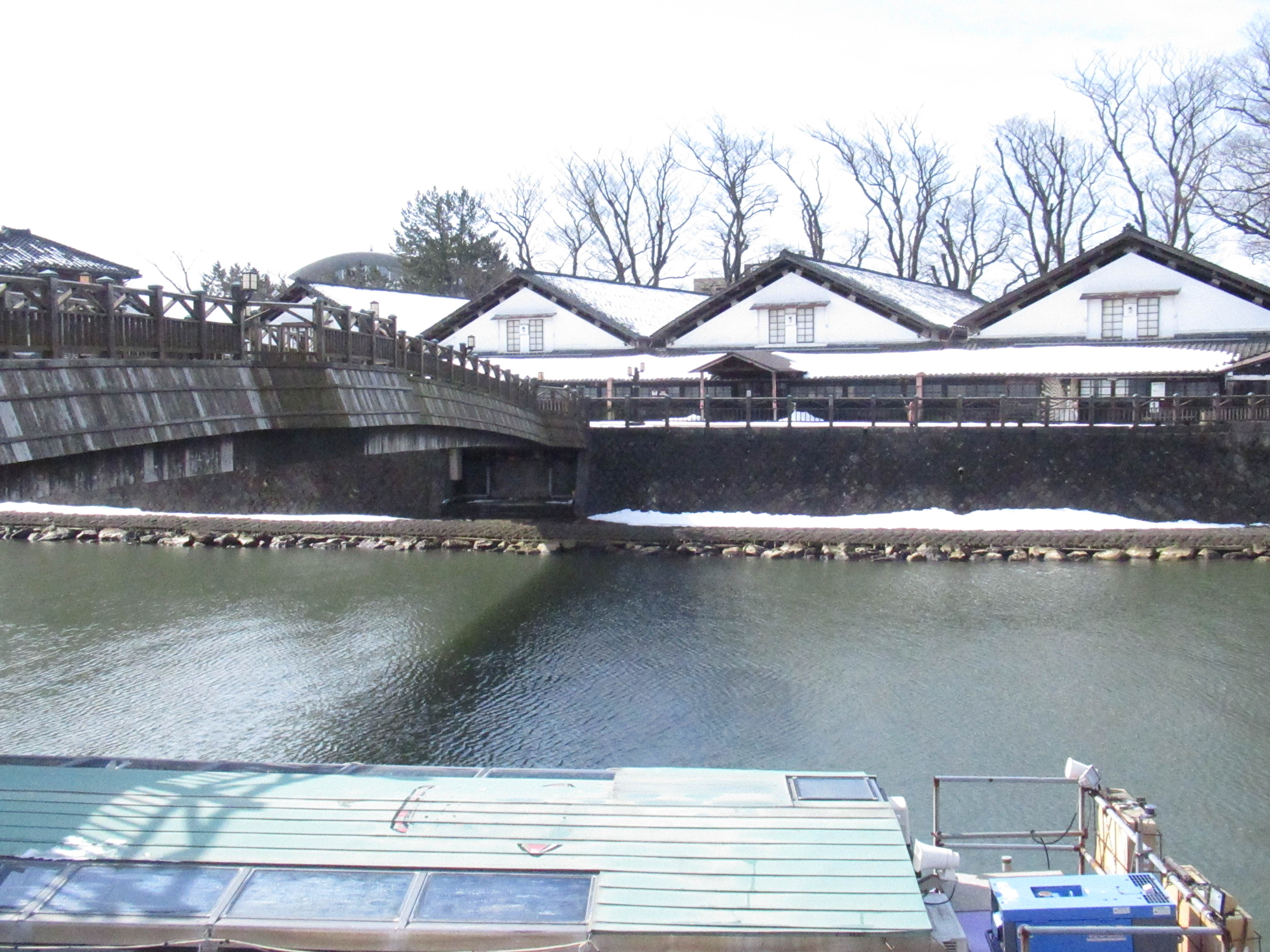 写真でよく見る風景は倉庫の裏で、三角屋根に黒い板壁、緑の欅並木がとても絵になる。新緑の頃が一番美しく、今の時期は寒々としていた。裏から倉庫の外を回り、表に出る。表の姿も悪くない。特に、川の対岸からの景色は北前船で賑わった頃の雰囲気がよく残っている。