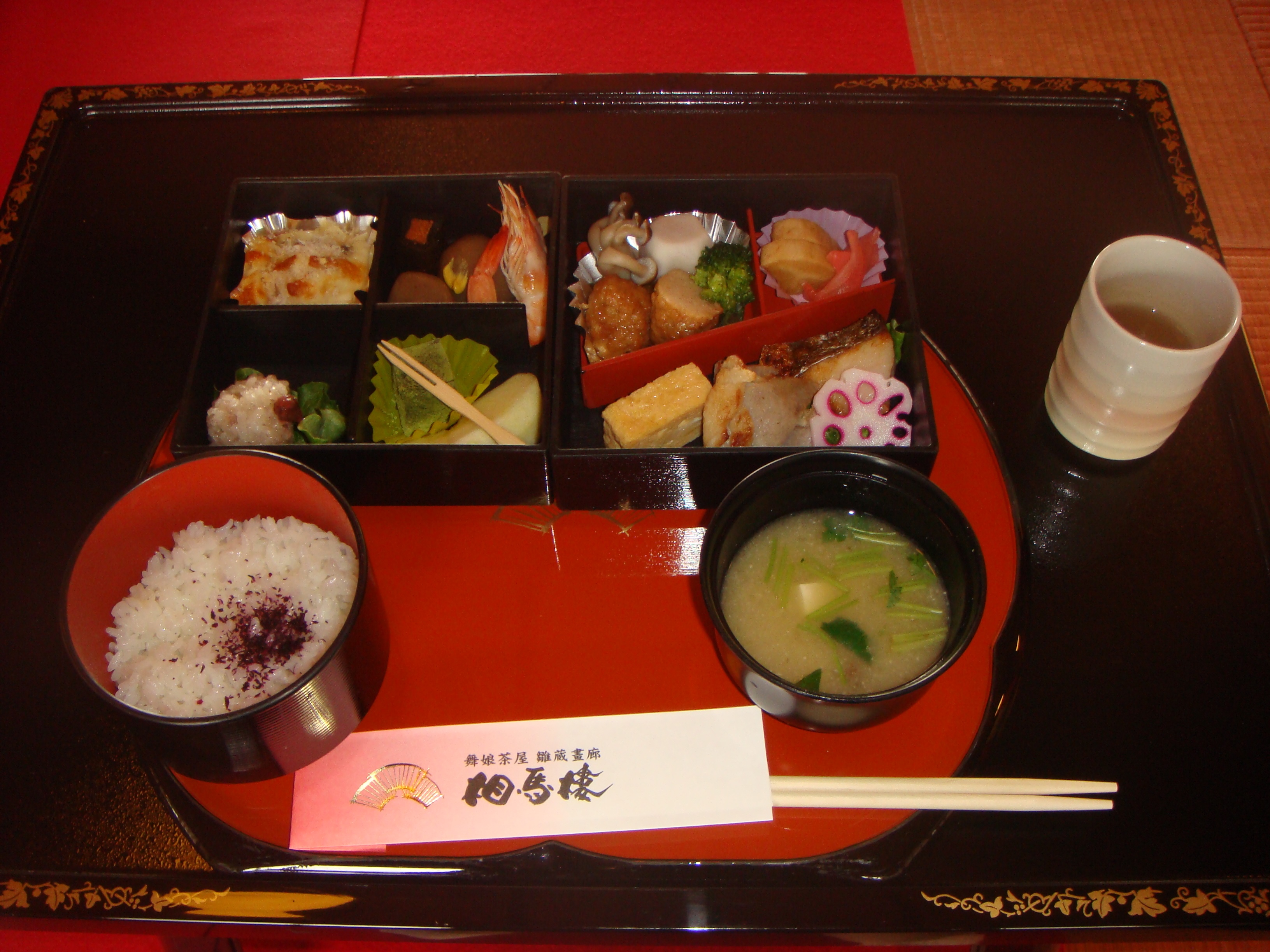 舞妓懐石(5,500円)を事前予約。到着すると、建物2階にある大広間の演舞場に案内され、既にお弁当が用意されていた。治郎兵衛という地元の割烹料理屋からお取り寄せで、ご飯と味噌汁以外は冷えている。さながら駅弁ようだが、不味くはなかった。