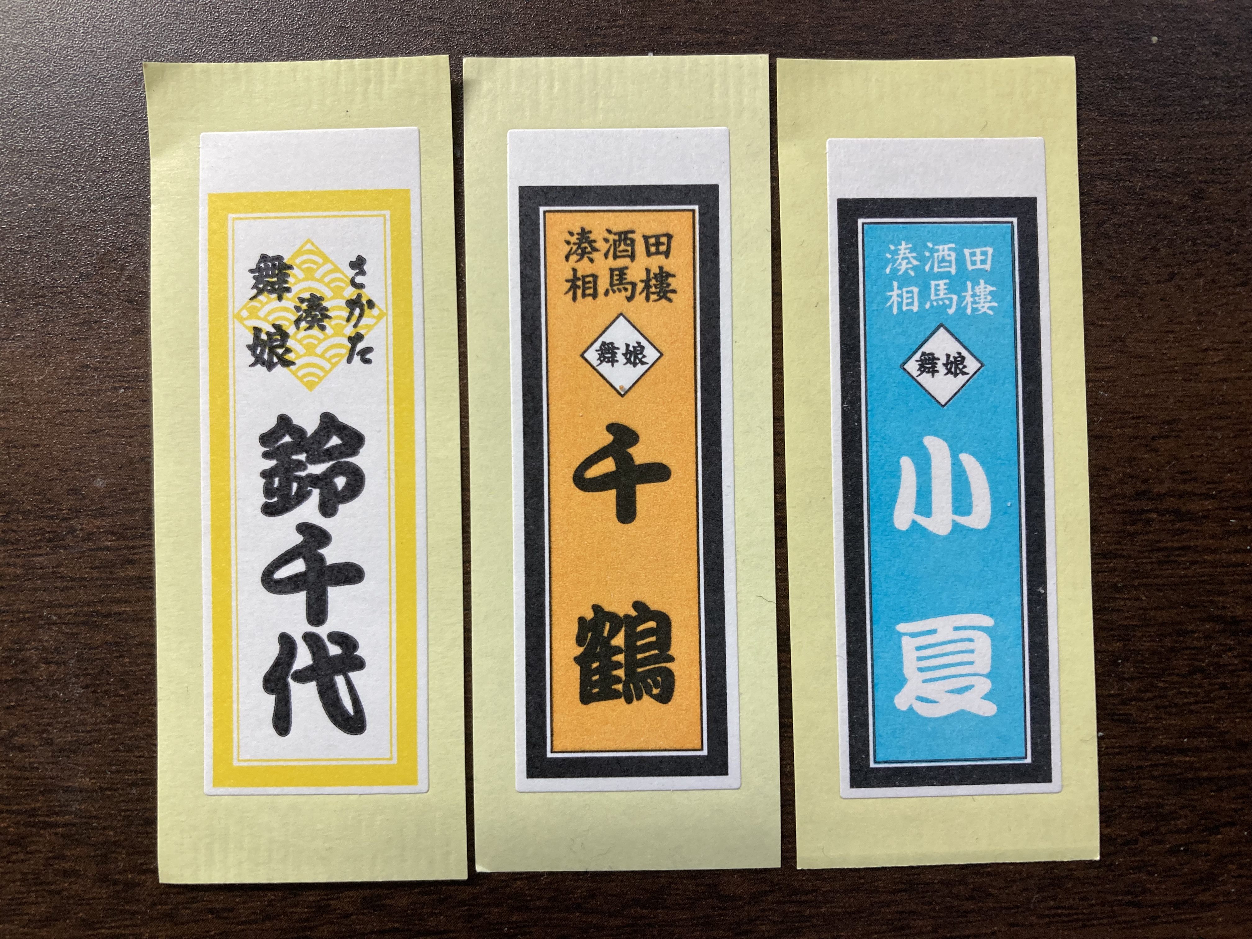 食事を終えると、酒田の観光ビデオを見せられた。その後、舞妓さんが登場し、舞妓演舞が始まった。短い演舞を3曲観賞したあと、記念撮影をして閉宴。最後に舞妓さんから千社札がプレゼントされた。舞妓さんとのふれあいは20分ぐらいで、その後は自由に館内を見学した。